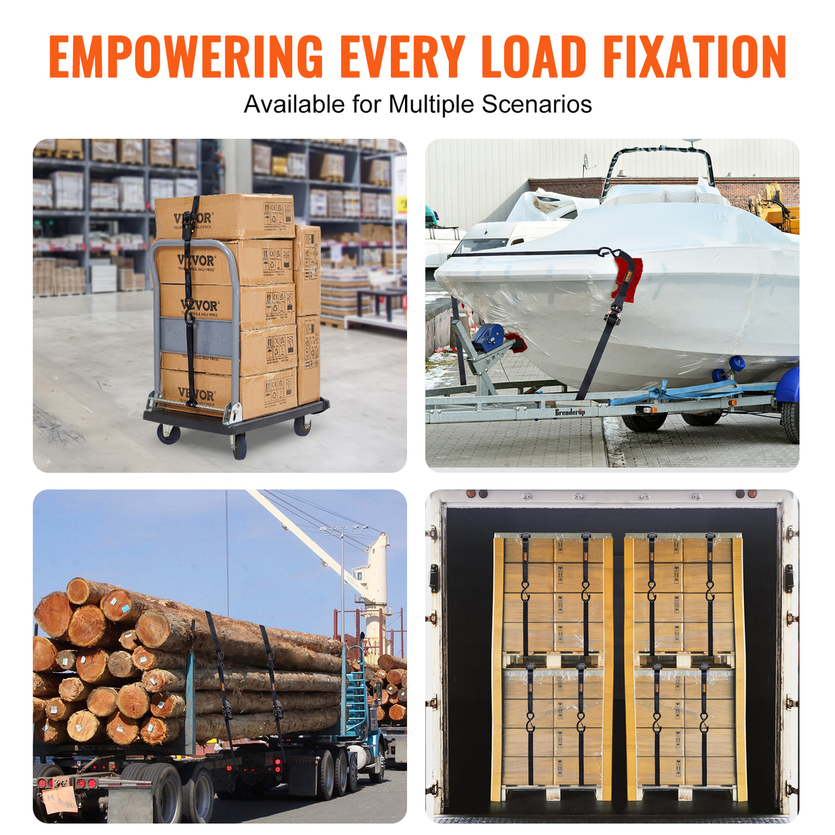 Versatile Application: VEVOR ratchet straps provide durable and reliable security for transporting various small and large objects, including motorcycles, canoes, kayaks, ATVs, boxes, boats, furniture, lawn equipment, heavy machinery, and other cargo via truck beds, trailers, or roof racks.