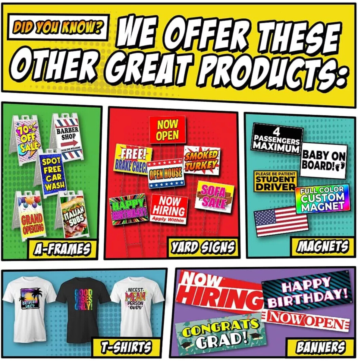 Our yard signs are perfect for business or personal use. Place these signs where they can be clearly read for passersby. At traffic intersections, events, yard sales, new business locations or election campaign events.