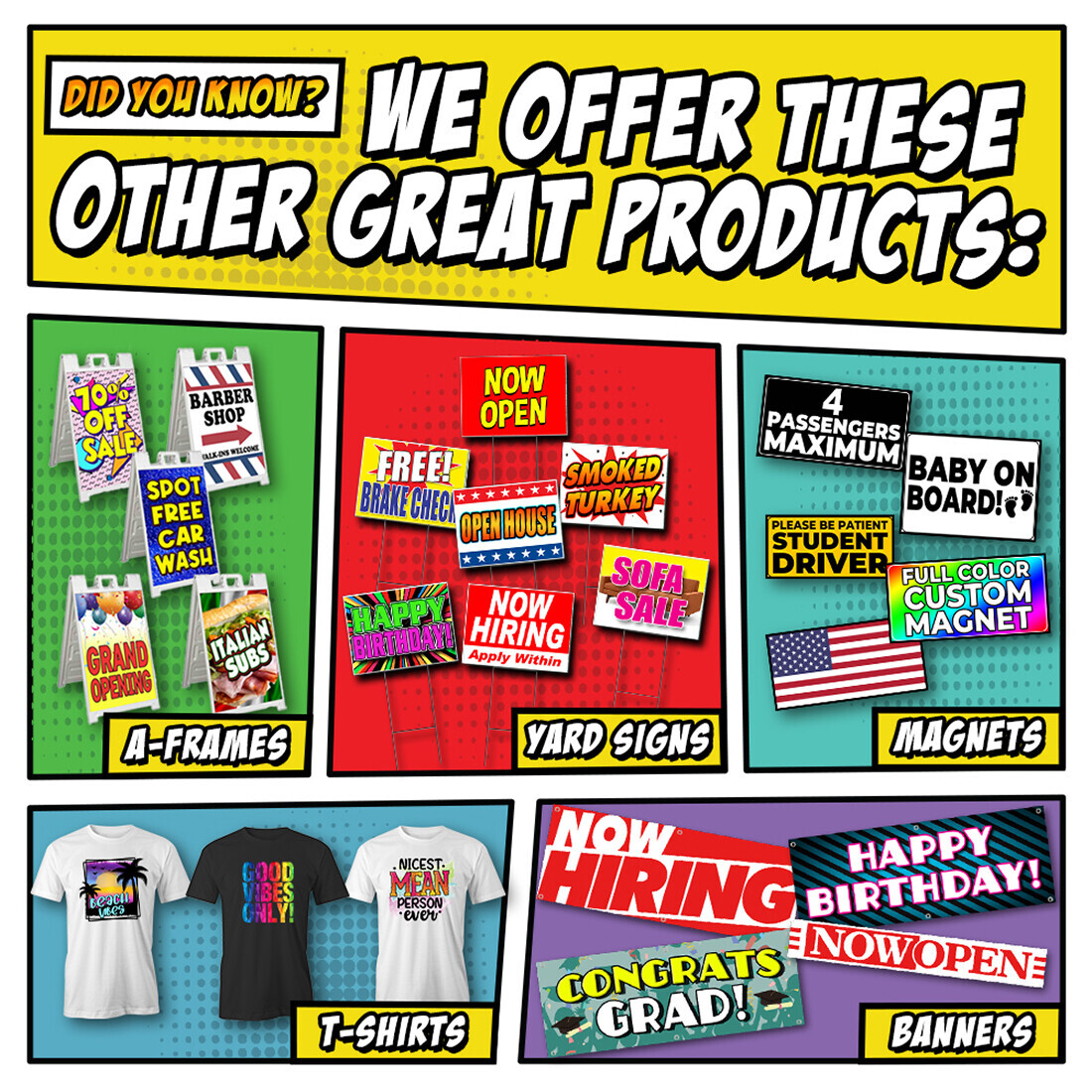 Our yard signs are perfect for business or personal use. Place these signs where they can be clearly read for passersby. At traffic intersections, events, yard sales, new business locations or election campaign events.
