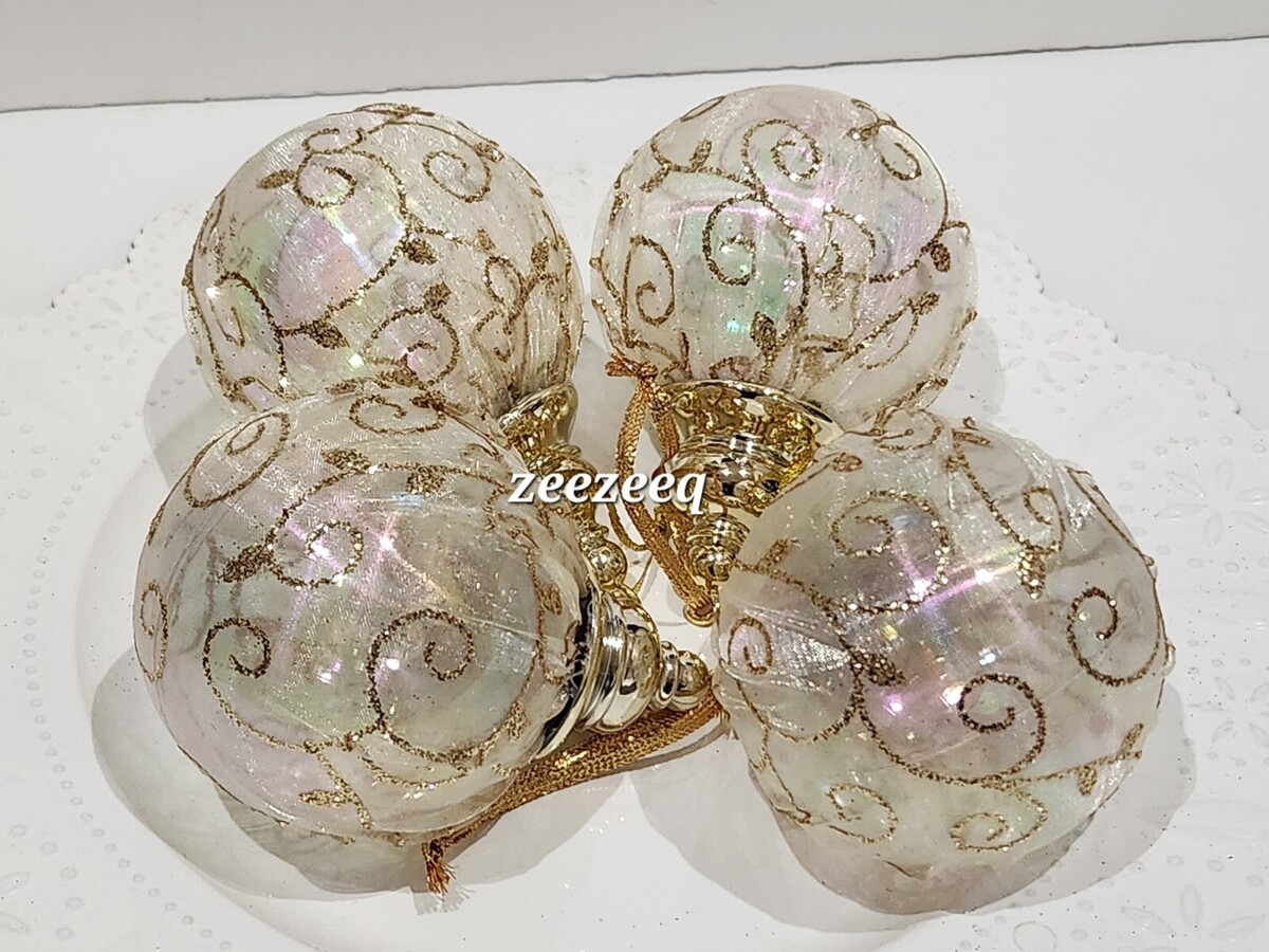 Christmas Sheer Gold Plastic Iridescent Clear Ornaments 4.75" Tree Decor 6pc