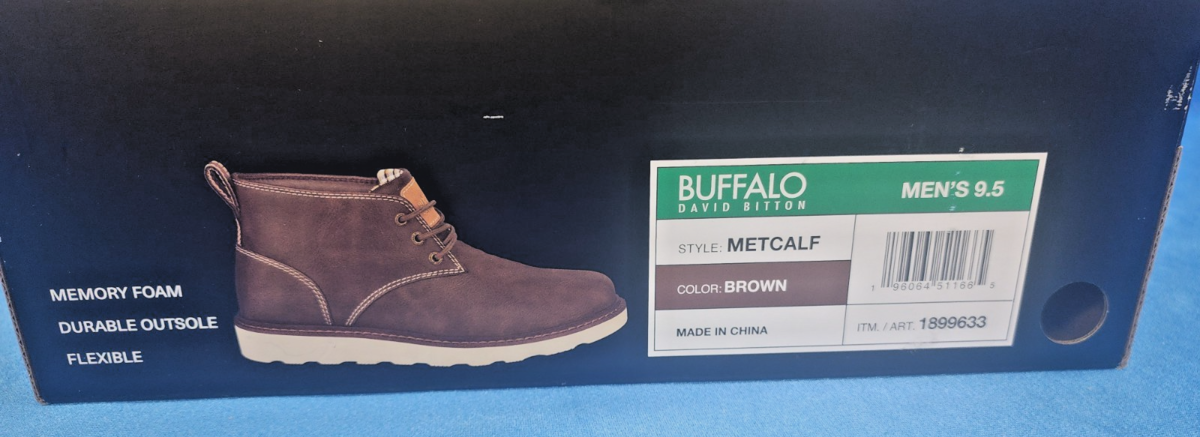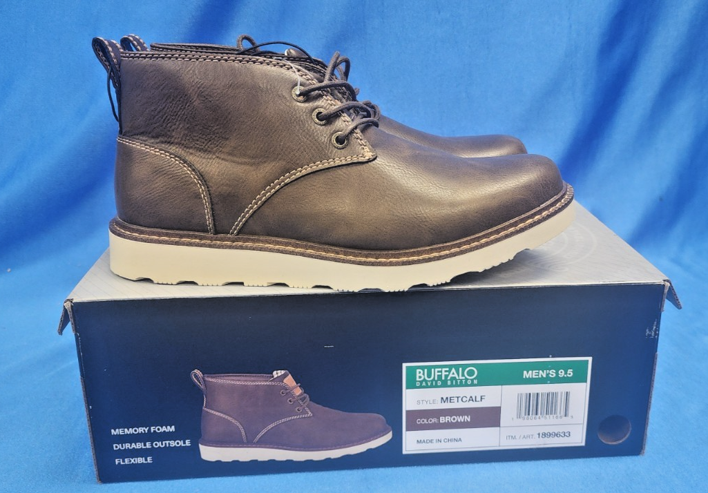 The BUFFALO David Bitton Metcalf Men's Boot in size 9.5 is a stylish and comfortable choice for casual occasions. This brown lace-up boot features a round toe shape, ankle shaft style, and memory foam insole for added comfort. Made from faux leather with a fabric lining, these Chukka-style boots are ideal for fall and spring seasons. The rubber outsole provides durability and traction, making them a practical choice for everyday wear.