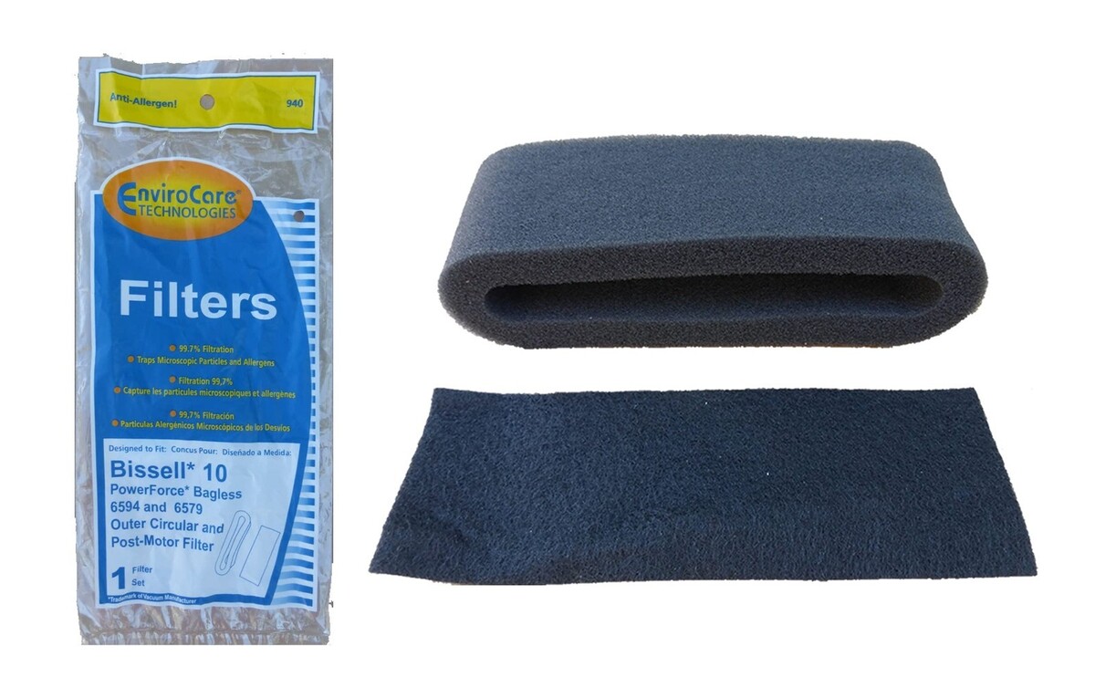 Envirocare Vacuum Filter Set Designed to Fit Bissell Type 10 Vacuums 940. 99.7 Percent Filtration. Traps Microscopic Particles and Allergens. Foam dirt cup filter. Designed to Fit: Bissell type 10 vacuums. Fits PowerForce Bagless 6594 and 6579. 1 Outer Circular wrap around filter and 1 Post-Motor filter. Manufacturer Part Number: 940. BR-18007 SC-18-2317-04