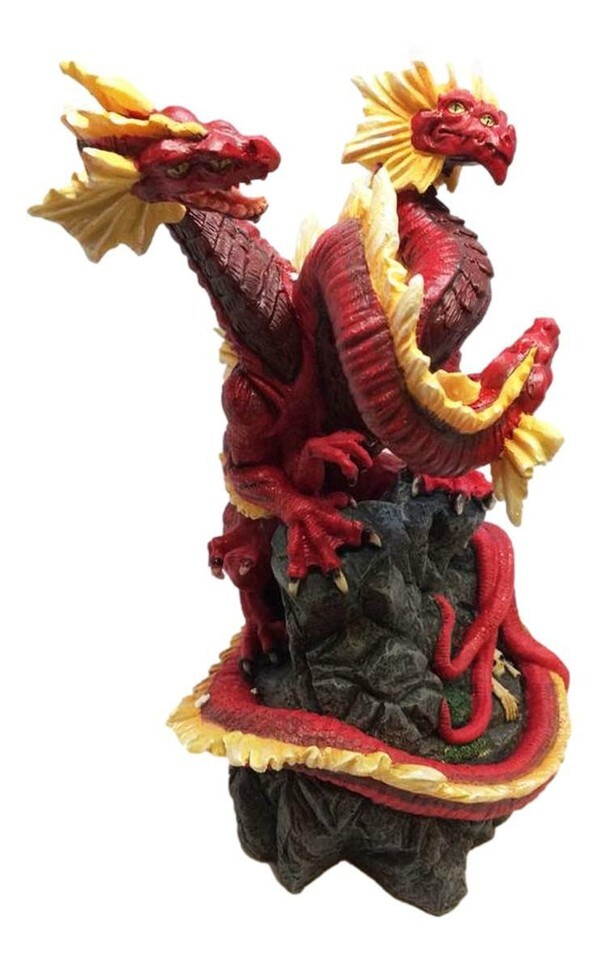 Red And Yellow Battle Hardened Volcano 3 Headed Hydra Dragon On Rock Statue