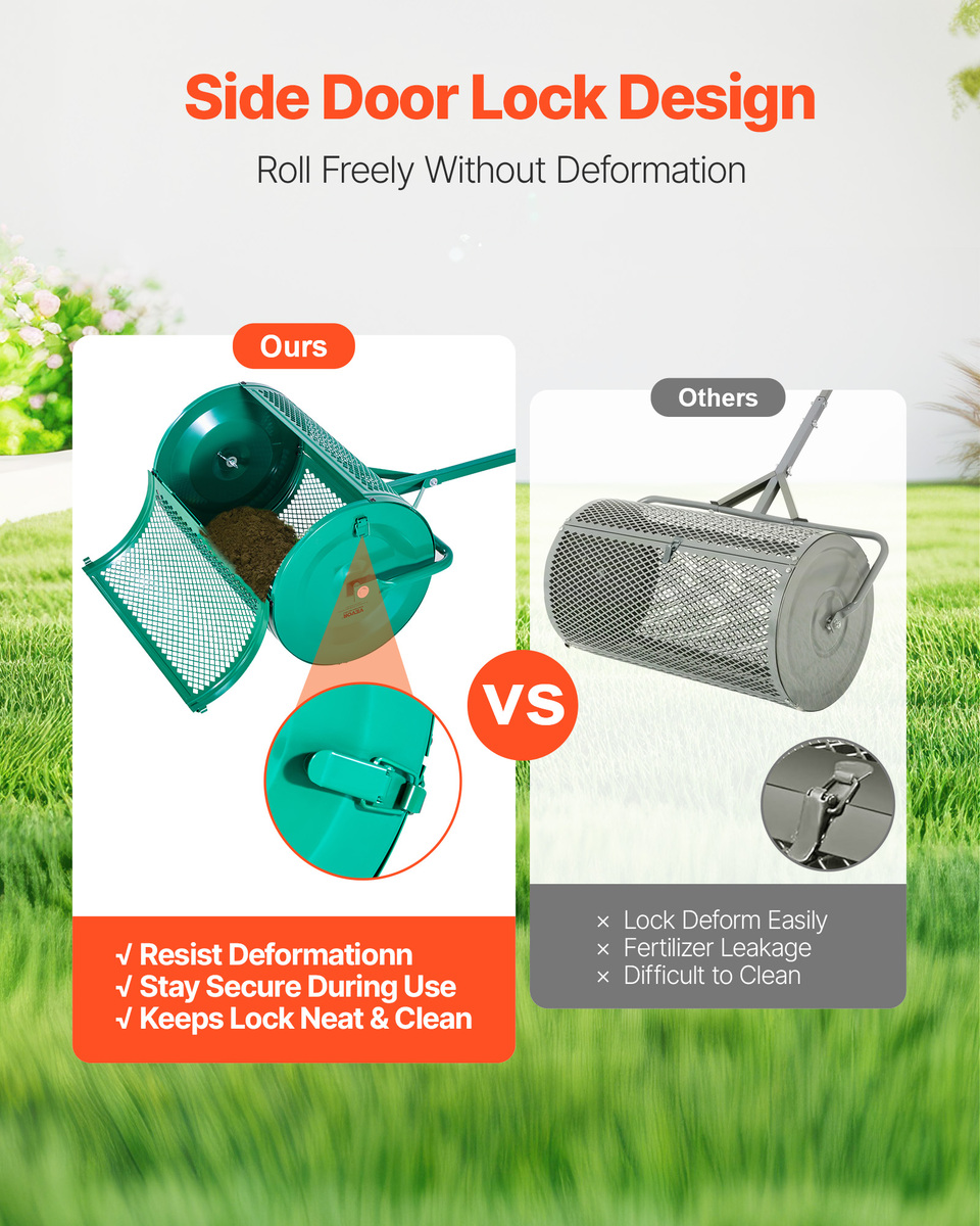 Large Capacity Roller: This 24-inch peat moss roller holds up to 2.66 cu.ft of material, reducing the need for frequent refills. Fill it once with grass seed, fertilizer, or soil amendments to complete large jobs faster and with less effort