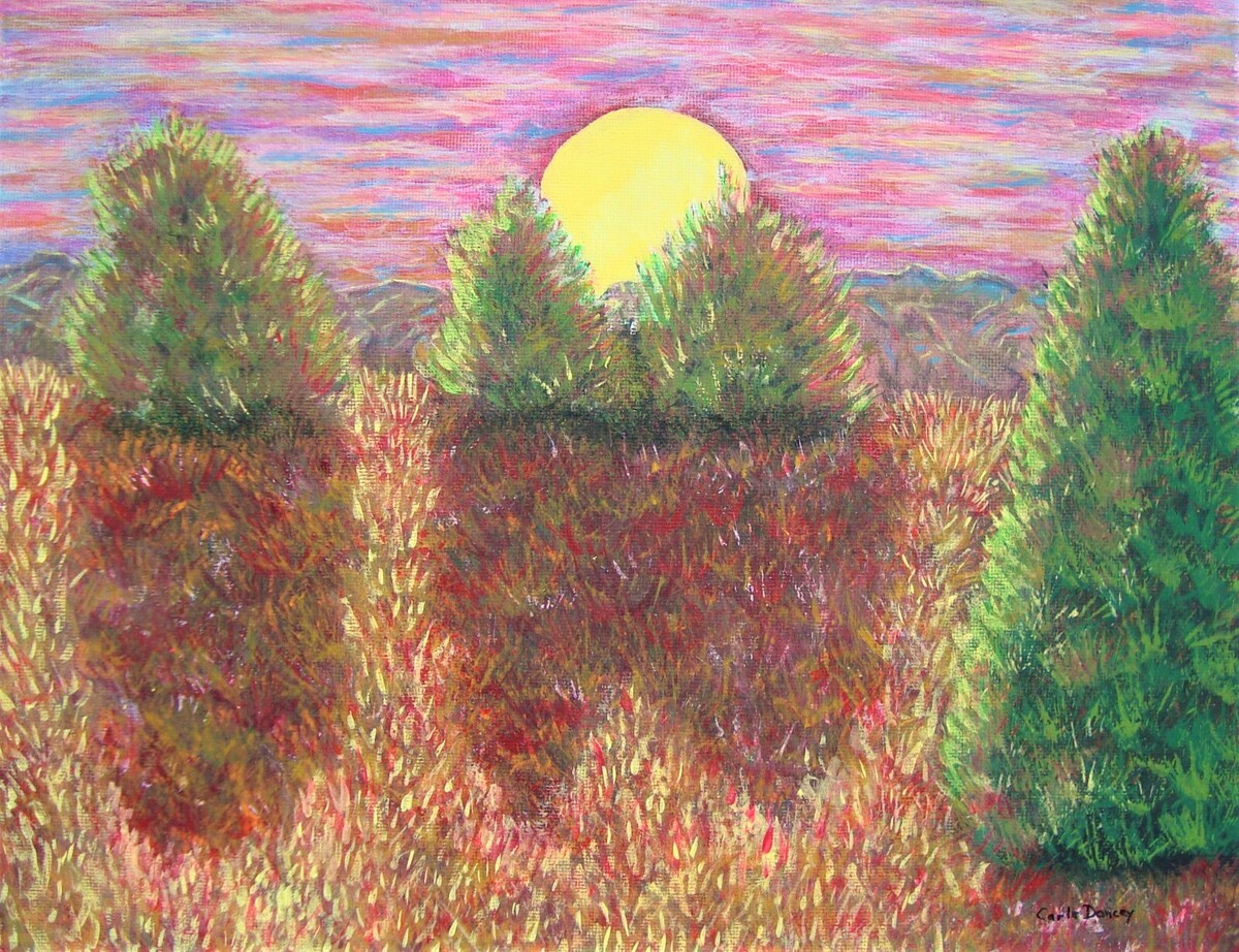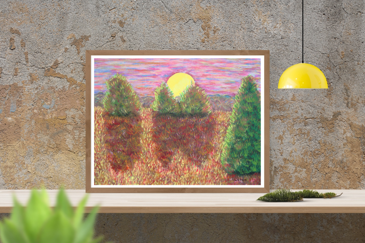 "Burgundy Sunset" is an original acrylic painting by Canadian artist Carla Dancey. This one-of-a-kind piece is signed by the artist and comes with a certificate of authenticity. Measuring 14 inches by 11 inches, the painting depicts a serene landscape of trees at sunset in shades of burgundy red, green, gold, and purple. The style of the painting is a blend of contemporary, realism, impressionism, and modernism, with influences from artists like Claude Monet, Pierre-Auguste Renoir, Bob Ross, and Vincent Van Gogh.
