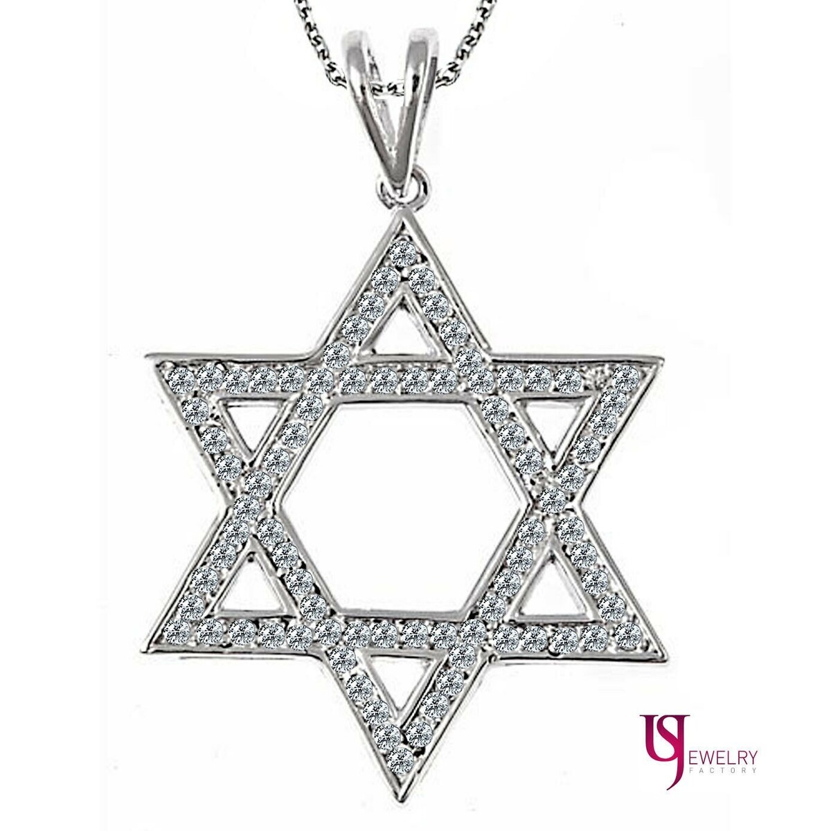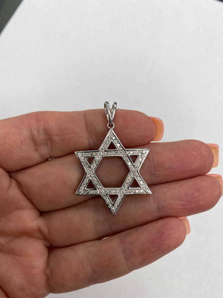 Dieser religiose 5,5-g-Anhanger verfügt über 84 Diamantakzente, die den gesamten Davidstern bedecken, insgesamt 0,75 Karat. Handgefertigt aus 14-karatigem Weißgold. 1 Gramm einer 16-Zoll-Rolokette ist im Lieferumfang enthalten.