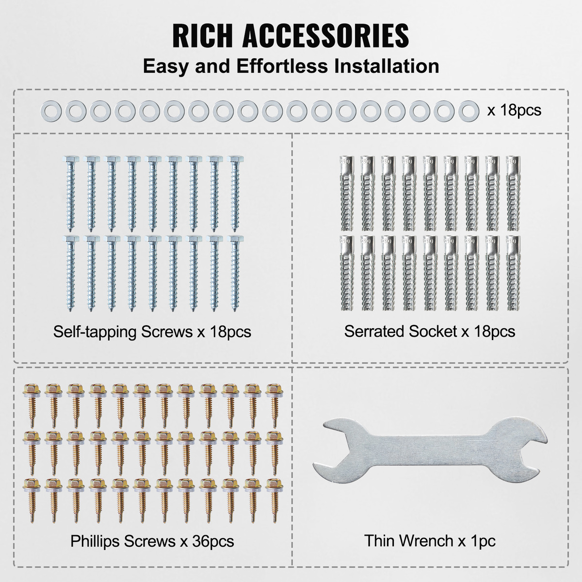 Complete Set Of Accessories: The kit includes a complete set of accessories: Dovetail Screws M525 (36pcs), Thin Wrench M8 Open-End 14 (1pc), Serrated Sleeves M8 (18pcs), Self-Tapping Screws M860 (18pcs). Installation is straightforward and hassle-free.