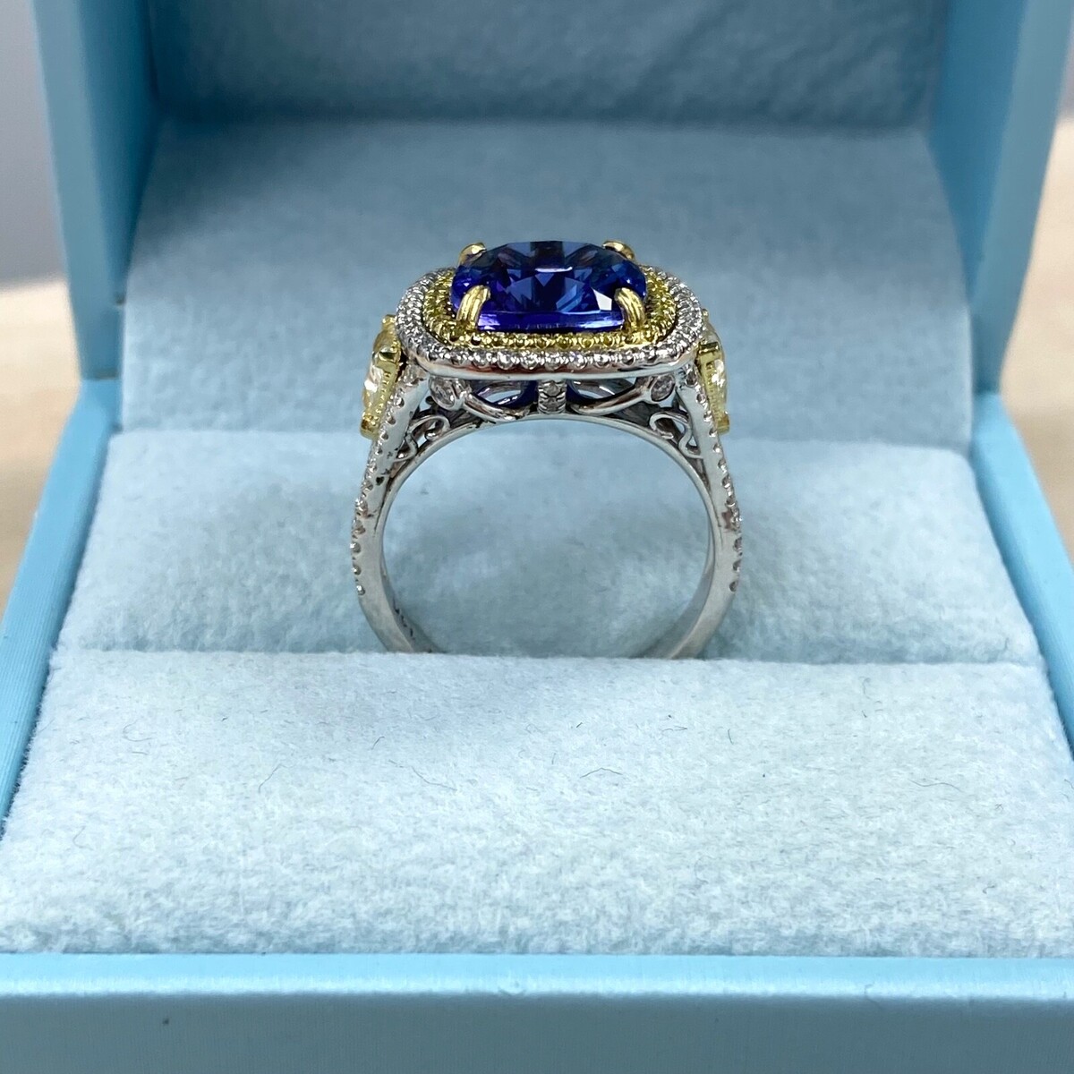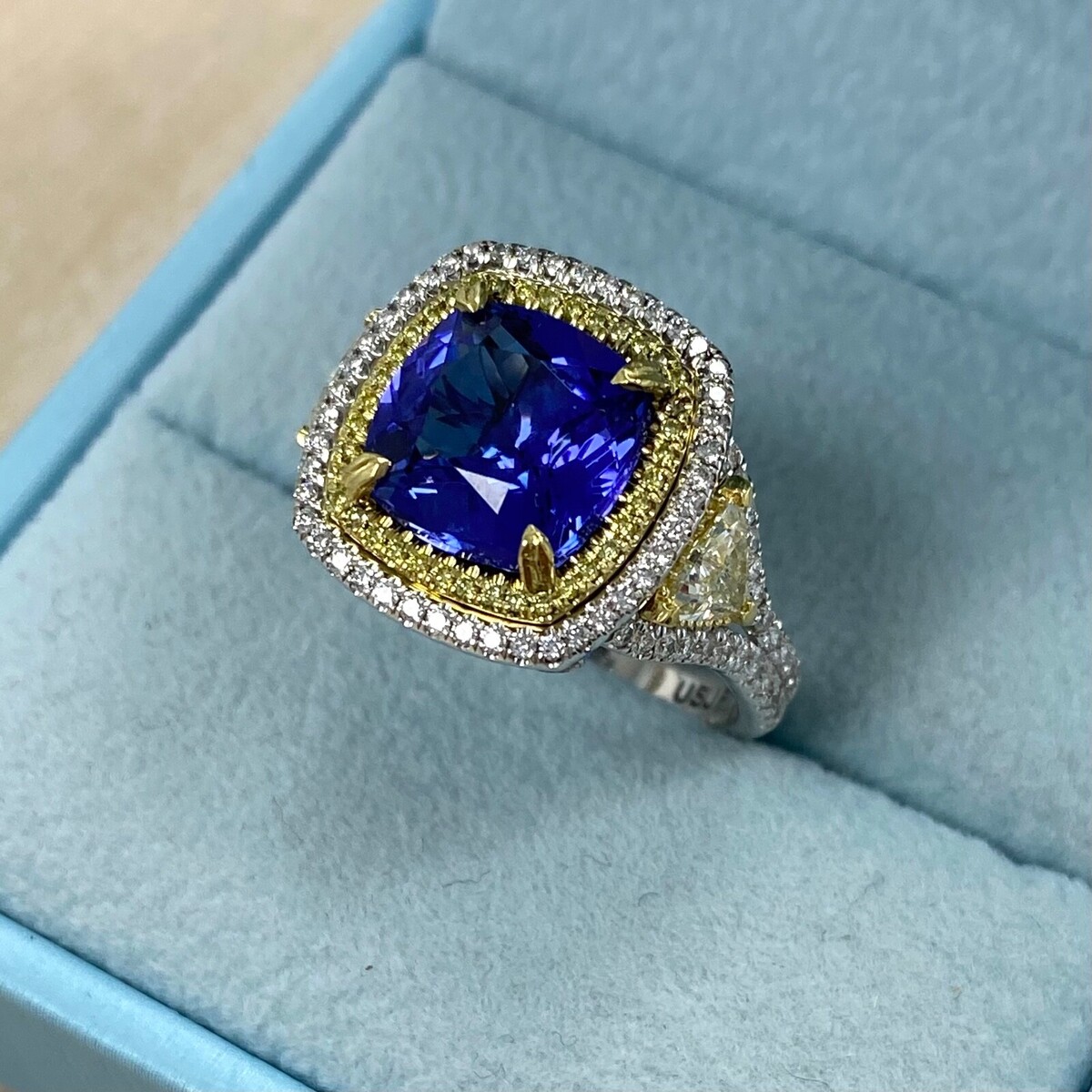 Cette bague est tout simplement magnifique, rayonnant d'elegance intemporelle. Il dispose d'un coussin de 4,15 carats tanzanite bleu-violet en son centre, entoure d'un double halo de diamants rond jaunes et blancs qui le rendent encore plus brillant. Sur les cotes, il y a des milliers de billions de diamants coupes ajoutant une touche supplementaire de sophistication. Fabriques avec de l'or bicolore 14K, les petits diamants sont delicatement places sous la galerie, ce qui lui donne une finition gracieuse et raffinee. Nos produits sont tous fabriques a la main avec de la qualite et des soins, au c?ur du district de Diamond sur la 47th Street a New York. Notre devouement et notre engagement envers le travail et la qualite fins depassent tous les autres. Etant donne que tous nos produits sont