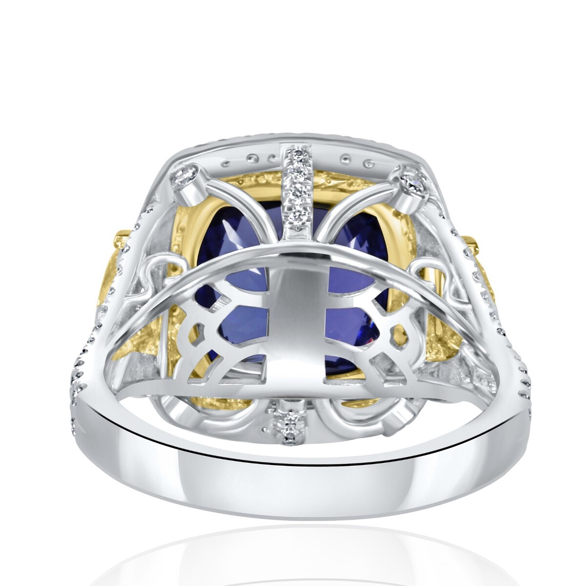 Cette bague est tout simplement magnifique, rayonnant d'elegance intemporelle. Il dispose d'un coussin de 4,15 carats tanzanite bleu-violet en son centre, entoure d'un double halo de diamants rond jaunes et blancs qui le rendent encore plus brillant. Sur les cotes, il y a des milliers de billions de diamants coupes ajoutant une touche supplementaire de sophistication. Fabriques avec de l'or bicolore 14K, les petits diamants sont delicatement places sous la galerie, ce qui lui donne une finition gracieuse et raffinee.