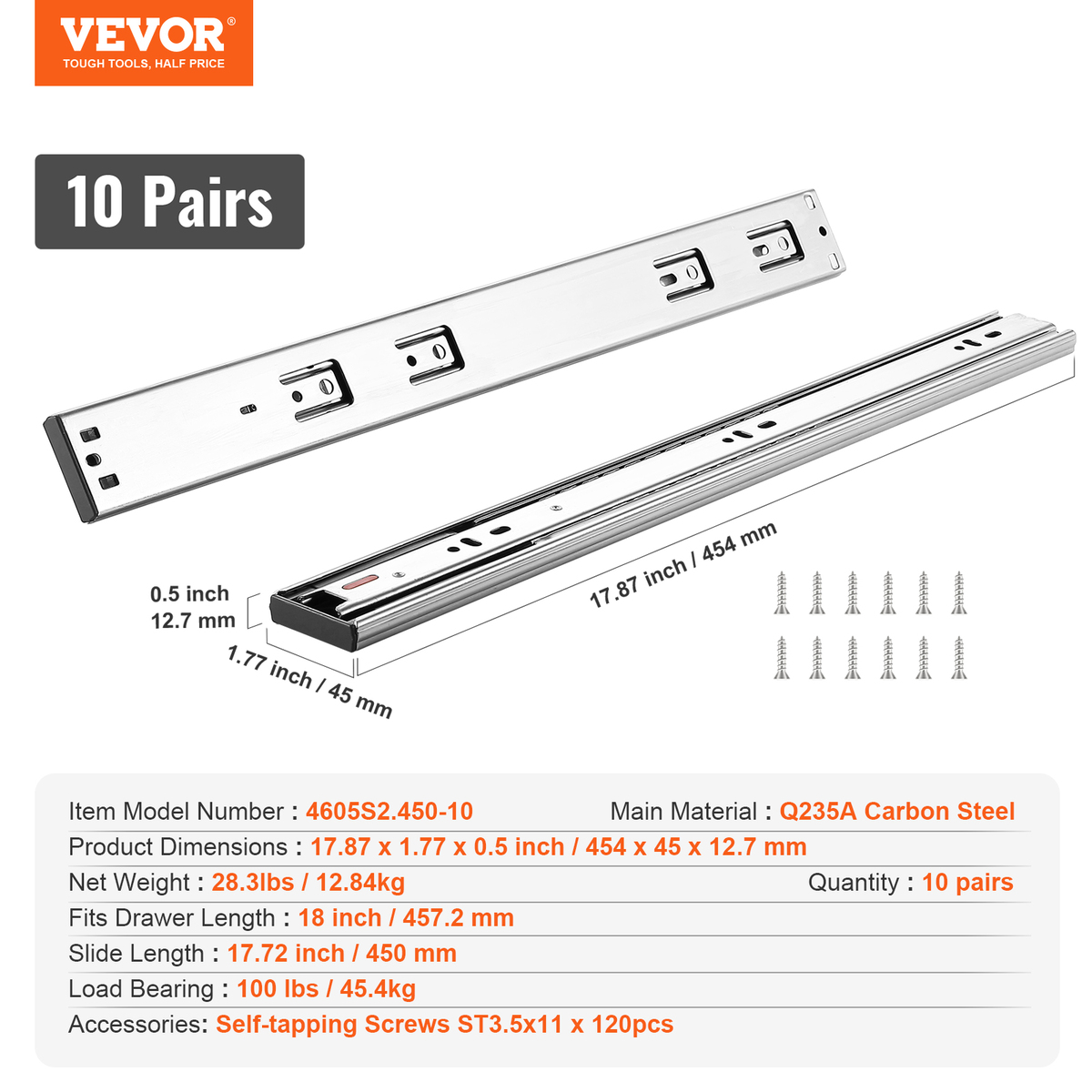 VEVOR 10 Pairs of 17.87" Drawer Slides Side Mount Rails, Soft-Close Noiseless