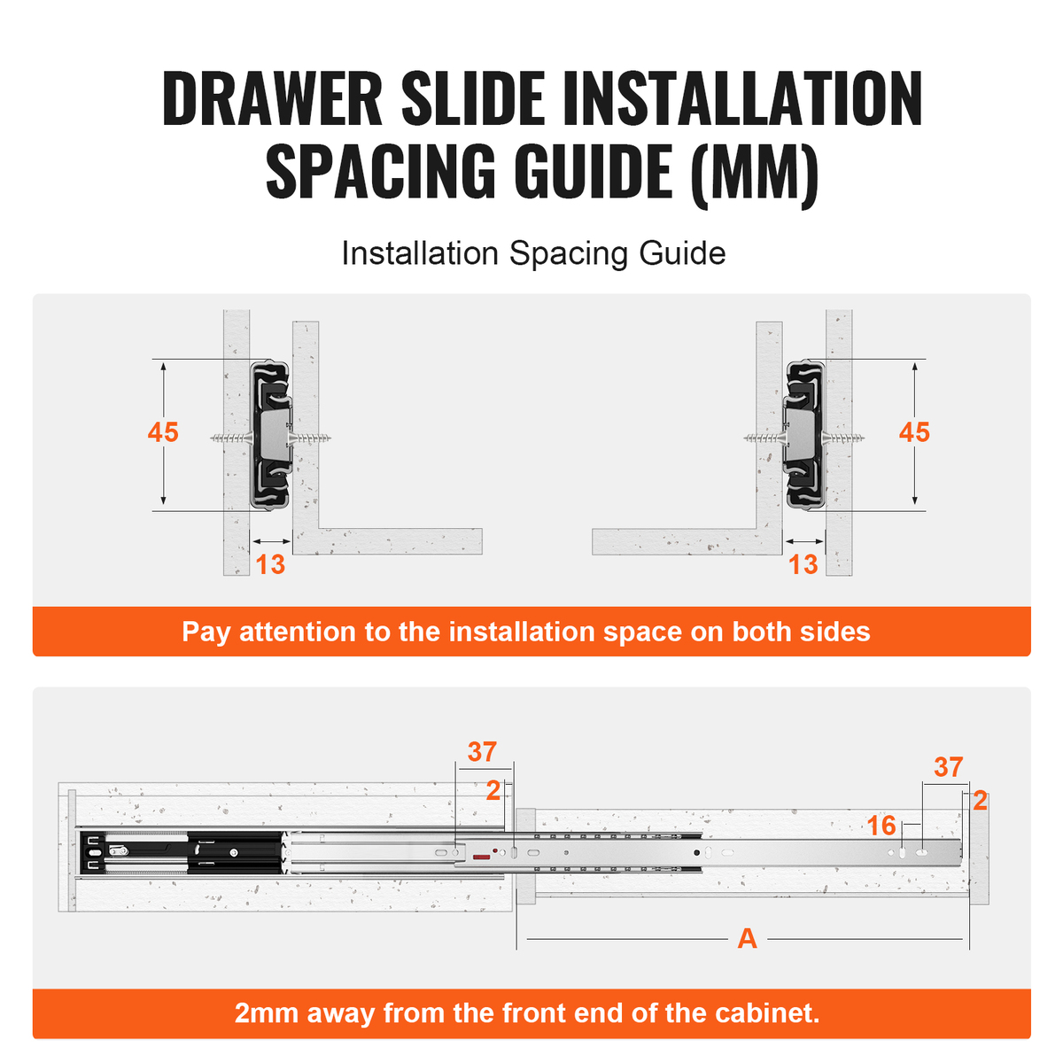 Installation Guidance: Our side-mount drawer slides are designed to address installation pain points. Specially designed installation spacing guidance places the slides 2mm from the front end of the cabinet, making the installation process easier and avoiding unnecessary hassles.