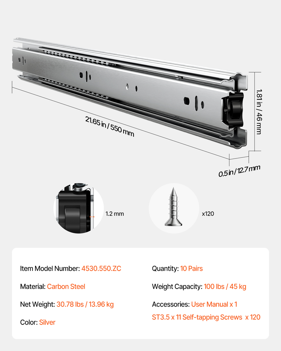 VEVOR Drawer Slides, 21.65", 10 Pairs Full Extension Ball Bearing Cabinet Rails
