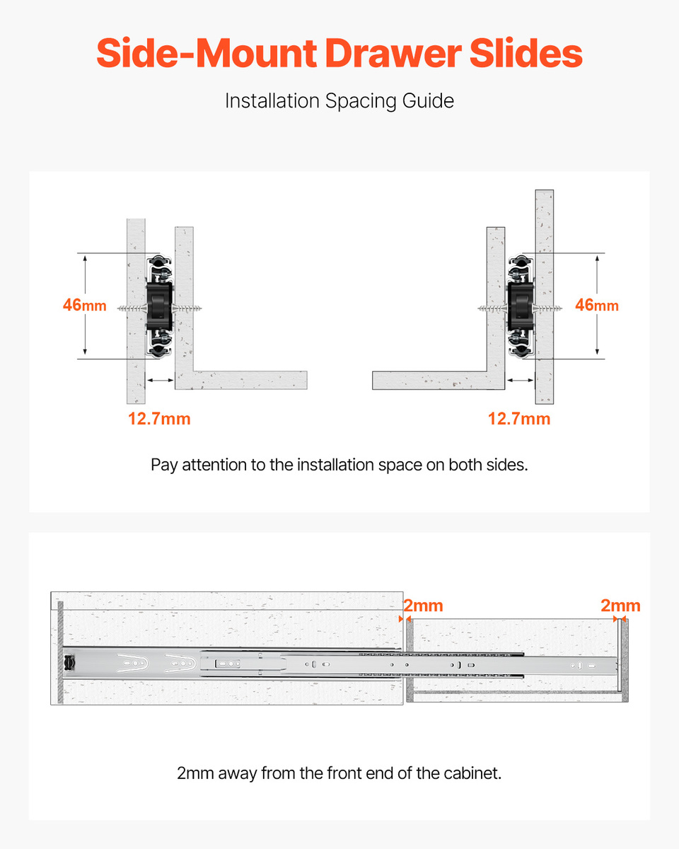 Installation Guide: Our side-mount drawer rails are designed to address common installation challenges. The specially designed installation spacing guide ensures a 2mm distance from the front of the cabinet, making the installation process easier and preventing unnecessary hassles