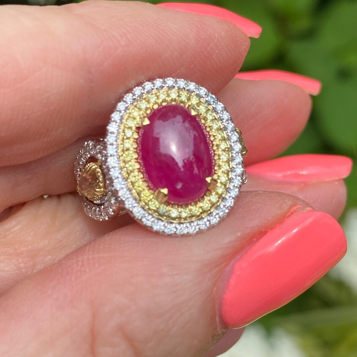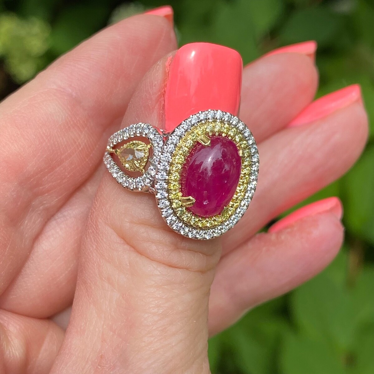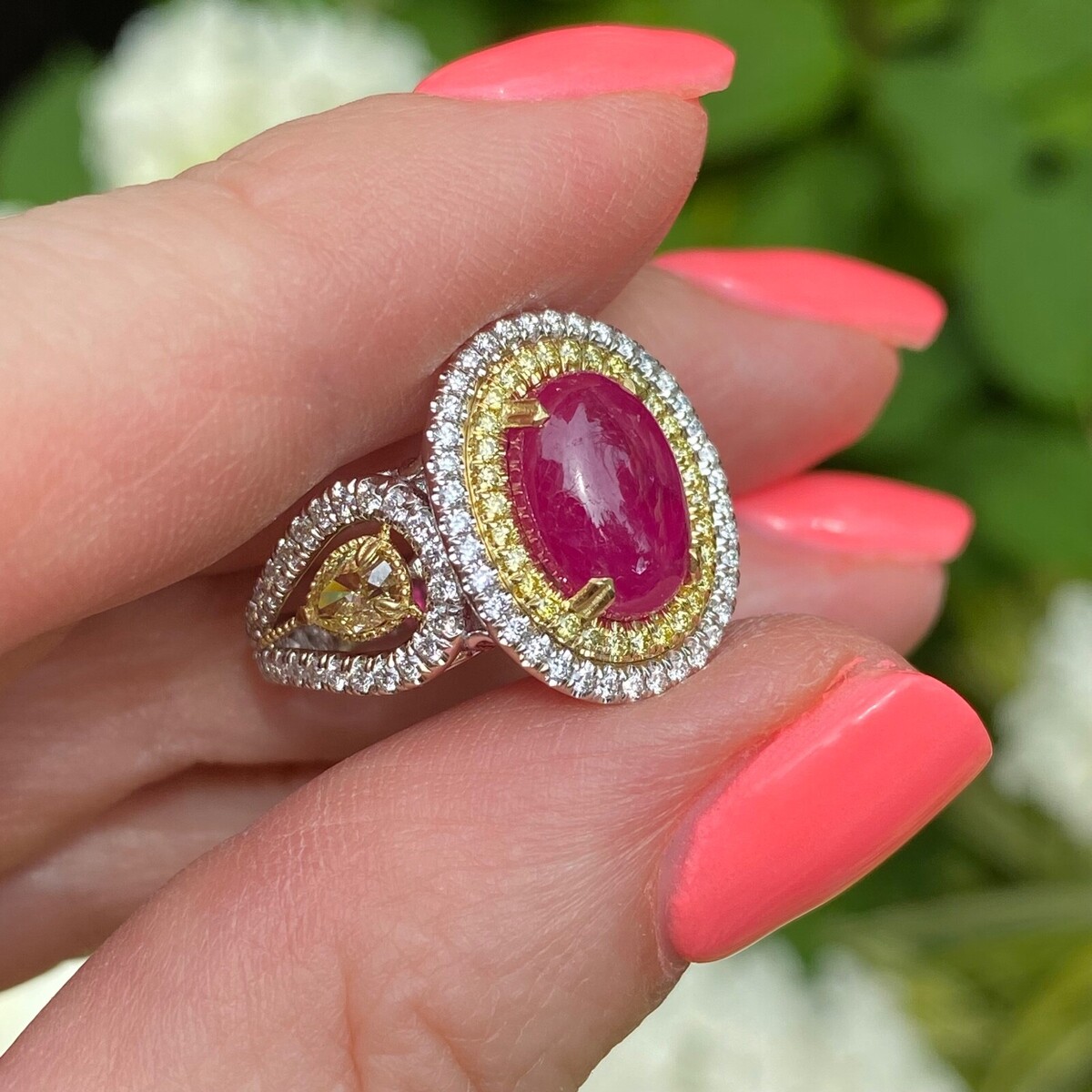Dieser fantastische Ring verfügt über einen 4,91-Karat-GIA-zertifizierten purpurrot-rot, unbeheizten, ovalen, doppelkabrochon geschnittenen Rubin in der Mitte, umgeben von einem doppelten Halo aus gelben und farblosen runden Schnittdiamanten. Flanking der zentrale Rubin sind zwei birnenformige Diamanten. Diese Diamanten werden als "natürliche Phantasie" beschrieben, was darauf hinweist, dass sie einzigartige und wertvolle Farbeigenschaften haben! Der Ring besteht aus 18 Karat Gold, das ein zweifarbiges Design enthalt, das verschiedene Goldfarben für einen raffinierten Look kombiniert.