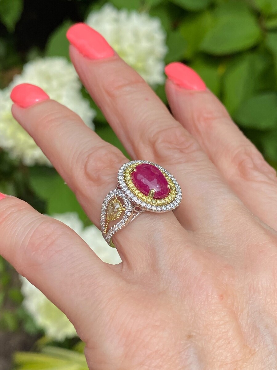 Dieser fantastische Ring verfügt über einen 4,91-Karat-GIA-zertifizierten purpurrot-rot, unbeheizten, ovalen, doppelkabrochon geschnittenen Rubin in der Mitte, umgeben von einem doppelten Halo aus gelben und farblosen runden Schnittdiamanten. Flanking der zentrale Rubin sind zwei birnenformige Diamanten. Diese Diamanten werden als "natürliche Phantasie" beschrieben, was darauf hinweist, dass sie einzigartige und wertvolle Farbeigenschaften haben! Der Ring besteht aus 18 Karat Gold, das ein zweifarbiges Design enthalt, das verschiedene Goldfarben für einen raffinierten Look kombiniert. Unsere Produkte sind alle von Qualitat und Pflege im Herzen des Diamond District in der 47th Street in New York City hergestellt. Unser Engagement und unser Engagement für eine gute Arbeit und Qualitat überst