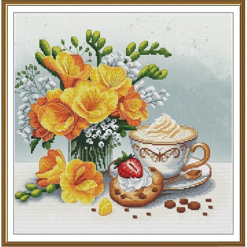 Cosmo Morning Glory and Green Maple Seasonal Flower Arrangement Cross Stitch Kit. This cross stitch kit comes with everything you need to make the beautiful seasonal floral project. August: Morning Glory and Green Maple. Kit Includes: COSMO Embroidery Floss (100 percent cotton), 1m each, COSMO Embroidery Cloth (100 percent cotton), Embroidery Needle, Rectangle Wooden Frame 7.5 inches x 6.25 inches, Instruction Manual with Design Chart. Frame Size: Approximately 7-1/2 inches tall x 6-1/4 inches wide. Difficulty Level: Intermediate. No. 592308. CHK-592308