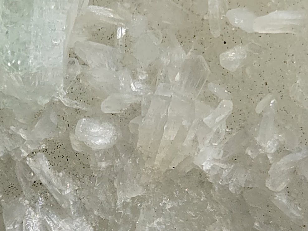 Presence of numerous slender, needle-like crystals that form radial or tufted aggregates with vitreous to waxy luster on the matrix surface is unique feature of this specimen.
