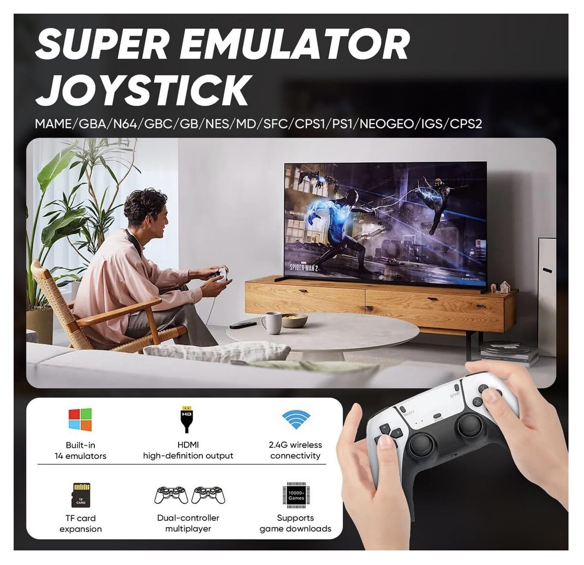 ? All Your Classics in One Place ? No need to hunt down old consoles or cartridges. Our advanced 14-in-1 emulator brings together a massive, ready-to-play library spanning the golden age of gaming into one portable device. ? Modern Play, Retro Soul ? We?ve enhanced the classics with sharp 4K upscaling on modern TVs and smooth 2.4G wireless controllers?so you get the authentic feel with today?s convenience. ? Designed for Sharing ? With two controllers included, it?s built for social play right from unboxing. It?s not just a personal time machine?it?s your go-to entertainment center for making memories together.