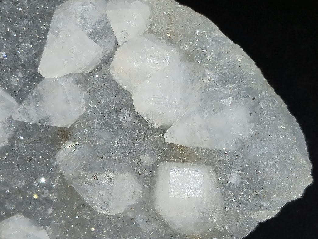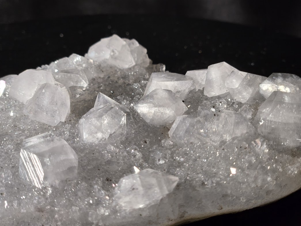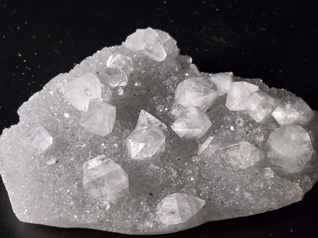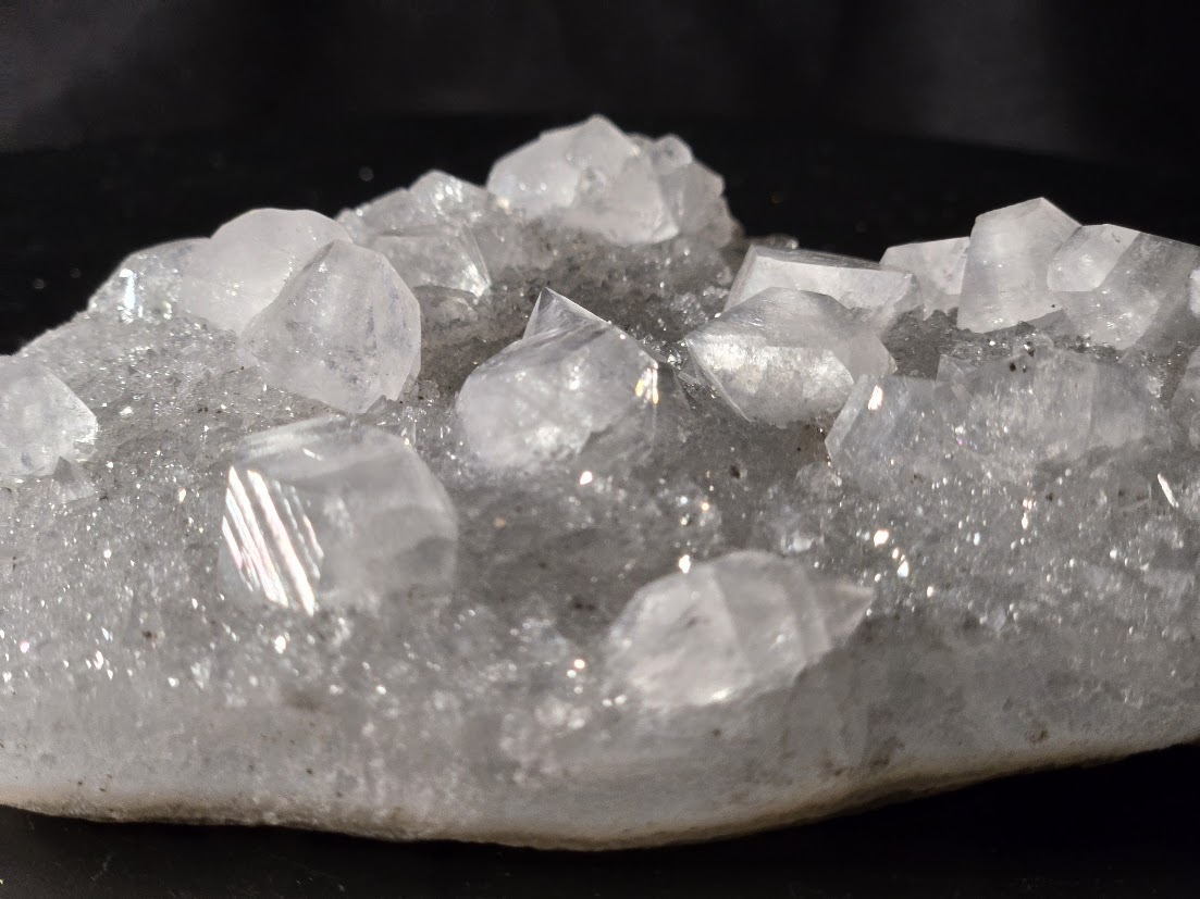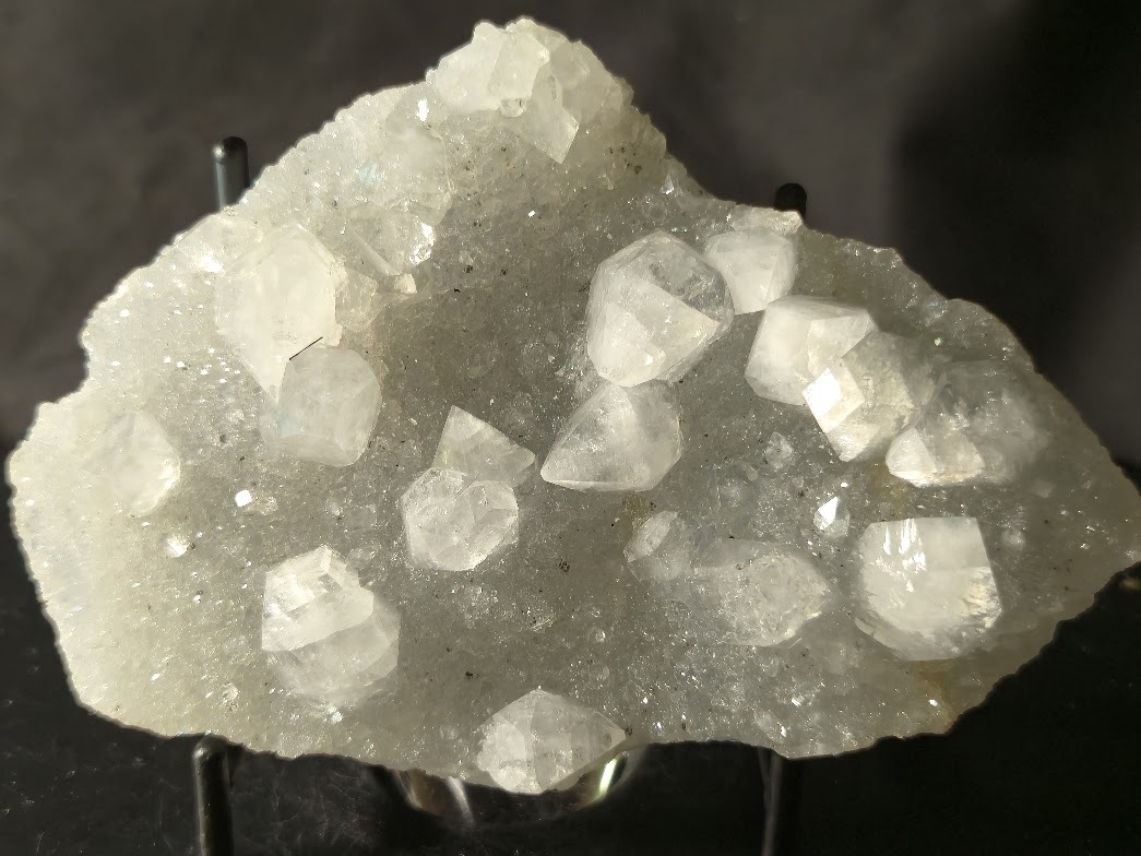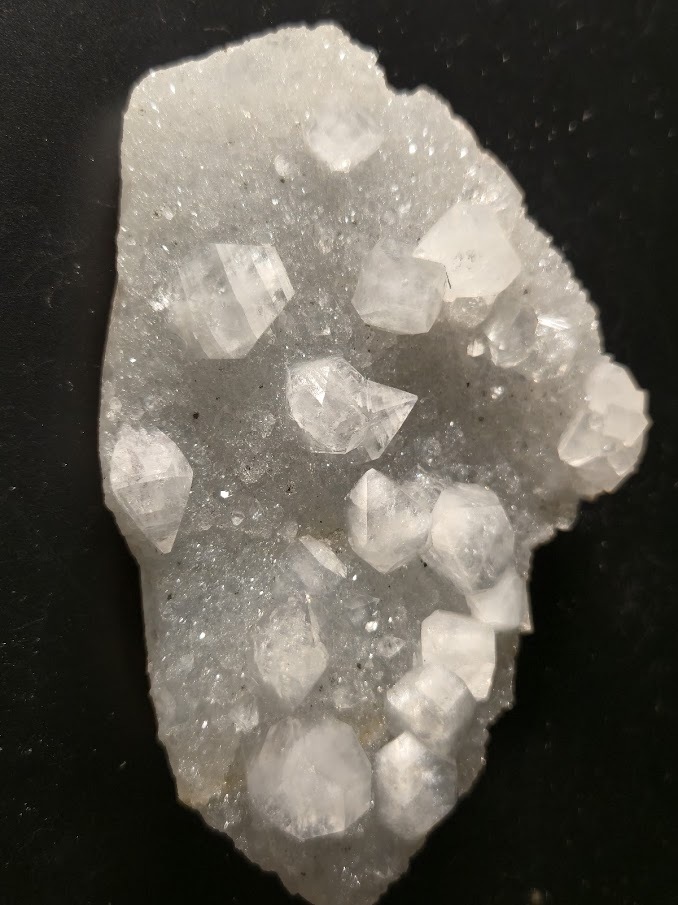Apophyllite Rare Collectible Mineral Specimen with distinctive translucent cubic, tabular, or pyramidal crystals on gray chalcedony.