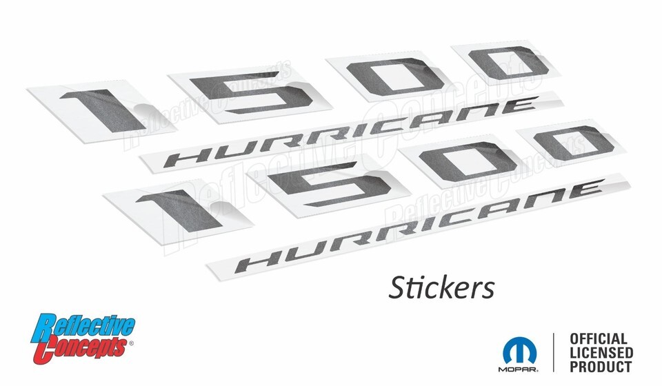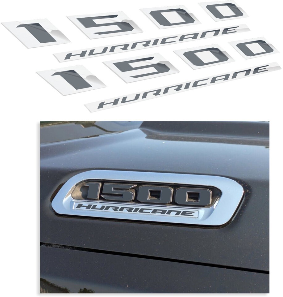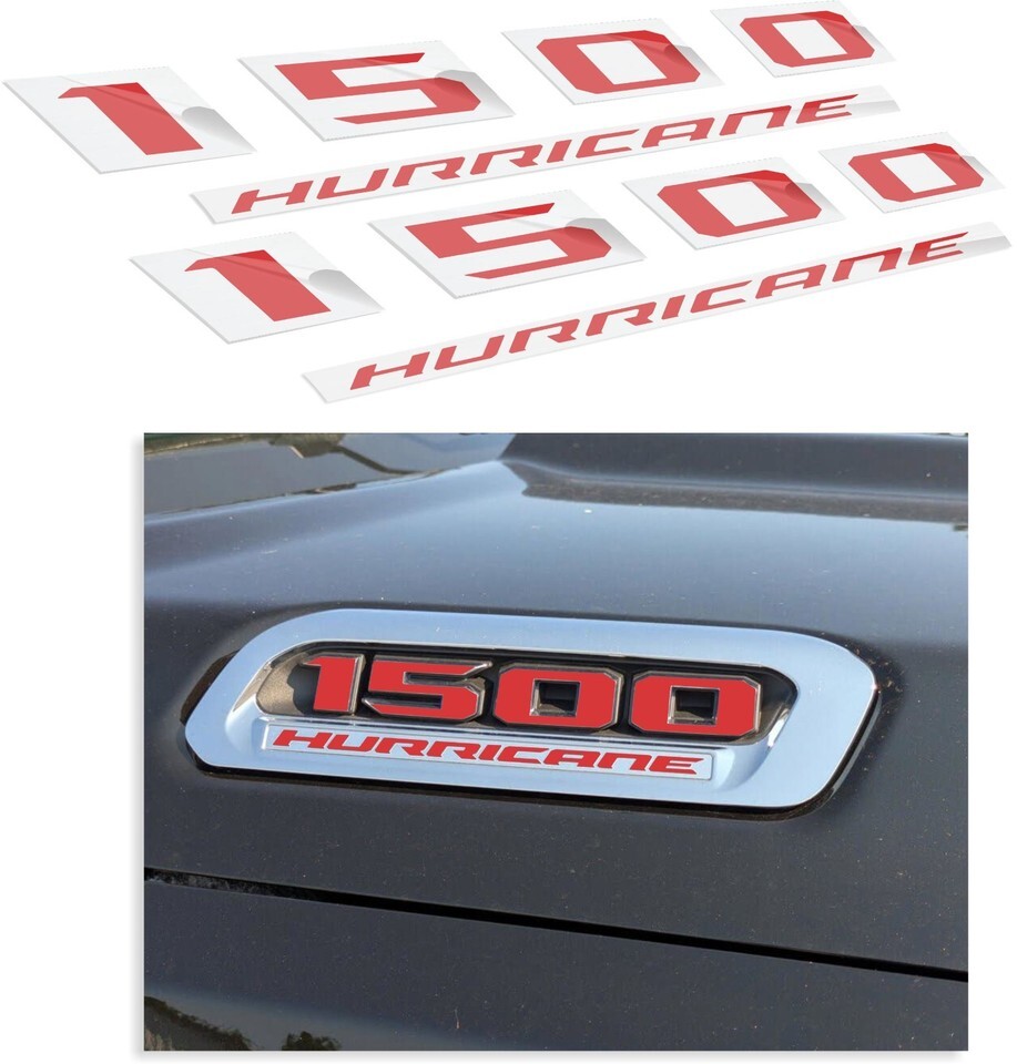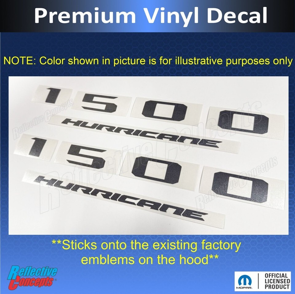 Decals (stickers) sized designed to be applied to the face of the existing emblems on the hood. Overlays the face of the 1500 and over the 'HURRICANE' lettering on the hood emblems.