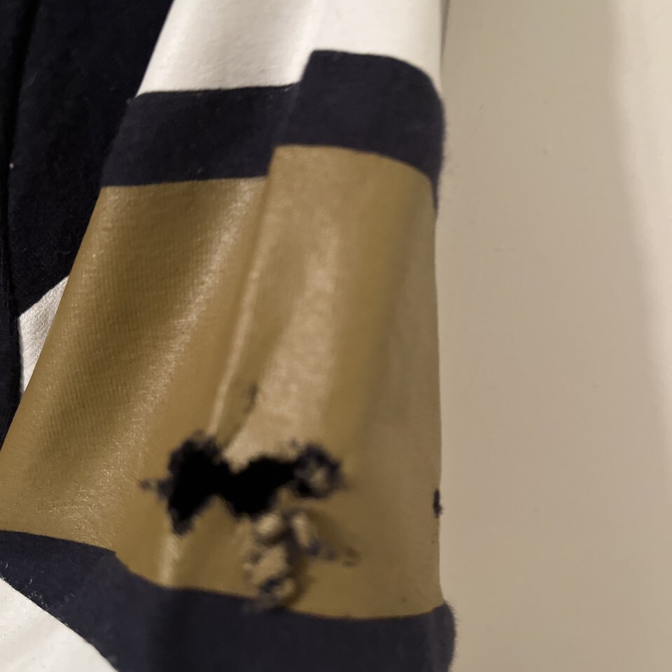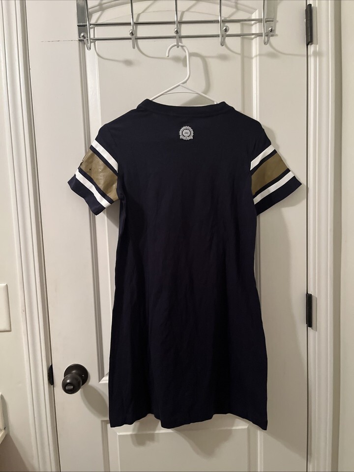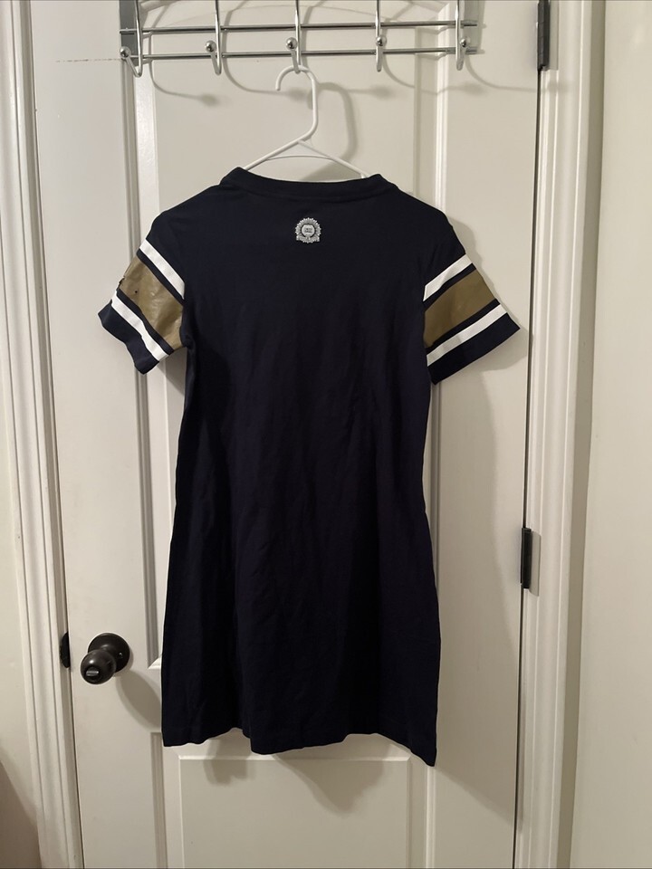 Georgia Tech Yellow Jackets Women's T-Shirt Mini Dress Slim Fit Size L Multi-Color in good condition. The is some cracking and peeled off areas as well as a few stains in areas and a large hole and a couple of smaller holes on the left sleeve. And a few stains on the dress/t-shirt as well. This can be worn as a long length t-short or as a mini dress for a shorts woman.