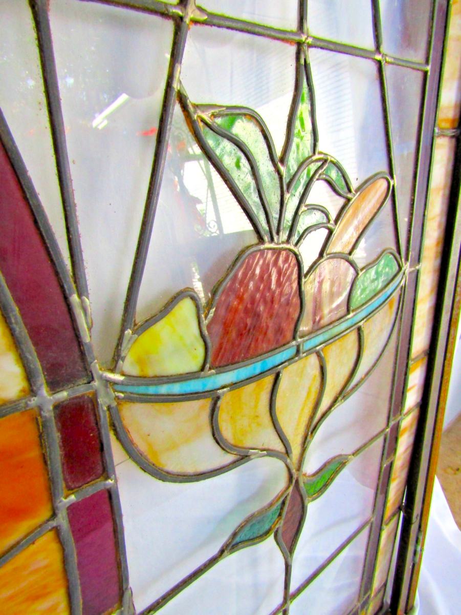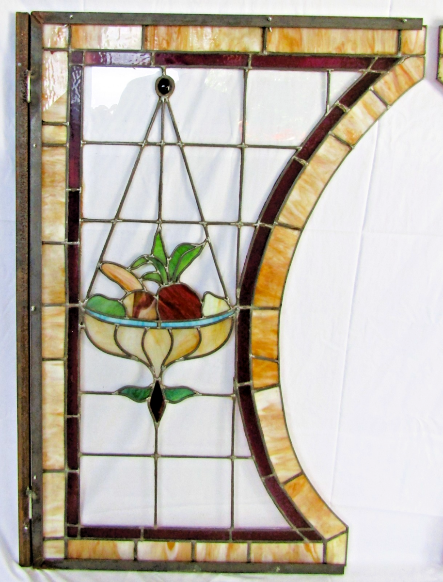 The windows feature a fruit basket with colors of green, rose, red, and amber glass set against clear panes. They are framed and are a matching set designed to fit together, possibly as part of a larger window or door. The cast iron side supports are still attached to the frame with the original hinges.