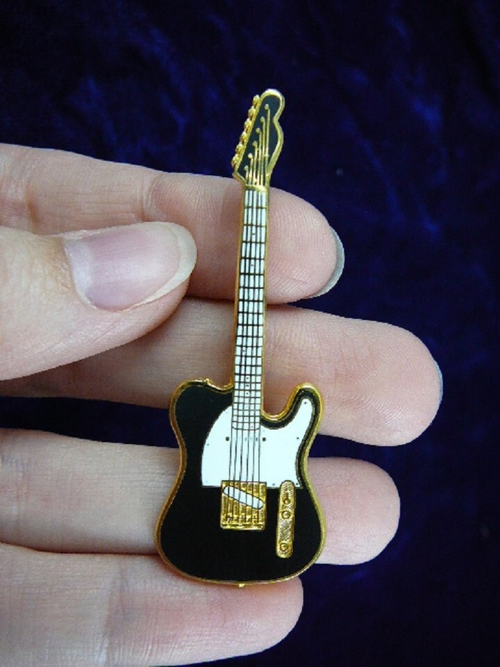(M223-A) JEWELRY ONLY - NOT A REAL GUITAR! Miniature replica (2 1/4") of the Fender Telecaster, introduced in 1951, one of the first solid body electrics. Replica in sturdy jewelry clasp pin form for guy or gal is complete with two single coil pickups and slanting back pickup, with cover removed. NOTE the Fender signature on the headstock.