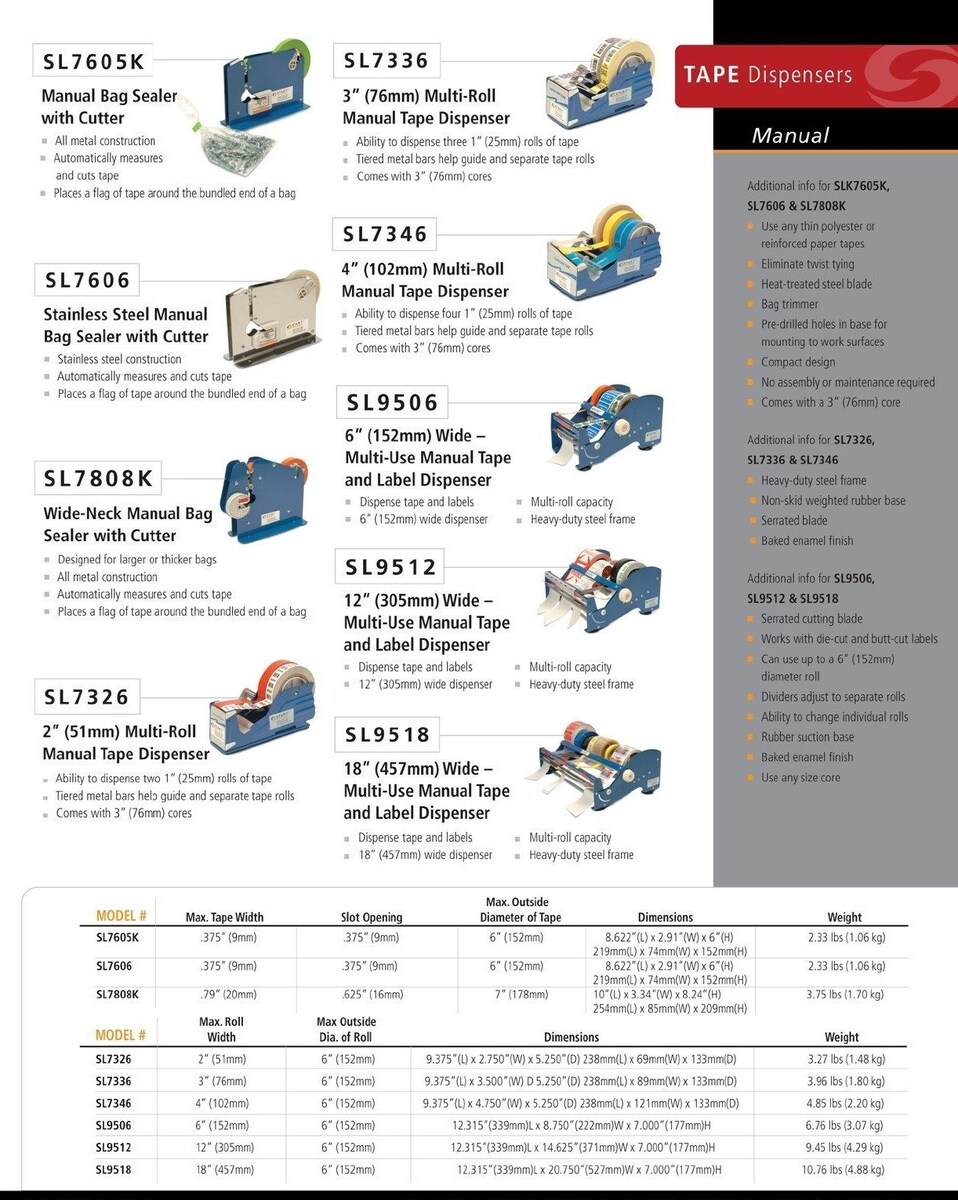 FOR SALE IS ONE (1) NEW INLINE MULTI ROLL 2" wide TABLE TOP TAPE DISPENSER FOR ONE (1) ROLL OR TWO (2) ROLLS BY POWERSEAL MADE BY START INTERNATIONAL MPN SL7326 UPC# 765794073264. THIS ITEM ALSO IS ALSO SOLD UNDER THE TAPE LOGIC BRAND AS THE EXACT SAME MODEL SL7326 DISPENSER. THIS COMMERCIAL GRADE 2" MULTI ROLL MANUAL TAPE DISPENSER CAN DISPENSE TWO 1" wide TAPES, OR, ONE 2" wide ROLL OF TAPE. TIERED METAL BARS HELP GUIDE AND SEPARATE TAPE ROLLS. UNIQUE SINGLE SPINDLE (axle) WITH TWO 1" CORES IS INCLUDED ALLOWS YOU TO USE JUST ONE ROLL OR TWO ROLLS UP TO MAXIMUM WIDTH OF 2 1/4" wide. THIS DISPENSER MAY BE SCREWED TO YOUR DESK (screws are included) FOR ADDED SAFETY AND FUNCTIONALITY. IT'S EASY TO GRAB THE TAPE YOU NEED WITH THIS SINGLE OR DOUBLE TAPE DISPENSER, TWO (2) INDEPENDENT GUIDES KEEP TAPES FROM OVERLAPPING. VERY STURDY HEAVY DUTY STEEL FRAME, BLUE COLOR BAKED ENAMAL, WITH PADDED BOTTOM AND MOUNTING SCREWS INCLUDED TO SCREW DOWN TO YOUR WORK SURFACE, DESK, TABLE, WORK BENCH, ETC (recommended). THIS GREAT TAPE DISPENSER ALLOWS YOU TO USE THE POPULAR AND INEXPENSIVE 2" wide CLEAR PACKING TAPE AVAILABLE EVERYWHERE. YOU may USE ABOUT ANY TYPE OF TAPE IN THIS PROFESSIONAL GRADE TAPE DISPENSER LIKE STRAPPING TAPE, MASKING TAPE, SCOTCH TAPE, BLUE PAINTERS TAPE, KRAFT PAPER TAPE, CARTON SEALING TAPE, FILAMENT TAPE, DUCT (duck) TAPE, FOIL TAPE, UP TO A MAXIMUM 6" outer diameter of roll. VERY SHARP 2 3/16" wide SERRATED CUTTING BLADE WILL CUT THROUGH ANY TAPE AND LAST FOREVER. IF YOU ARE AN ONLINE SELLER AND PACK MORE THAN A FEW PACKAGES DAILY, THIS DISPENSER WILL PROVE INDESPENSIBLE ALLOWING YOU FASTER, SAFER AND MORE ECONOMICAL DISPENSATION OF YOUR PACKING TAPE TO PACK, SEAL AND SHIP YOUR PACKAGES. YOU WILL RECEIVE ONE (1) POWERSEAL INLINE MULTI ROLL TAPE DISPENSER MODEL SL7326 MADE BY START INTERNATIONAL SHIPPED BY THE ECONOMY SHIPPER OF MY CHOICE DUE TO WEIGHT....