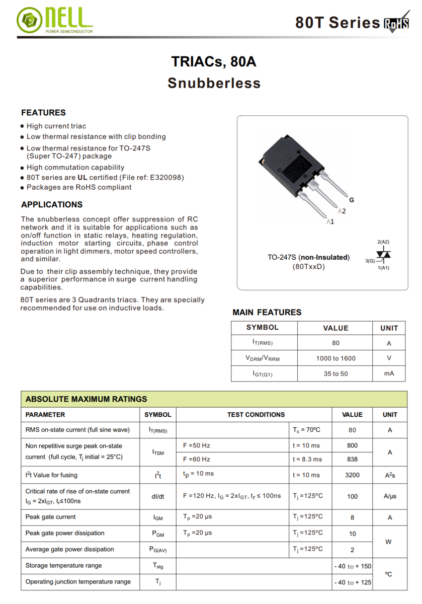 1X 80T12D NELLSEMI TRIAC 80A 1200V Thyristor non-insulated TO-247S-3