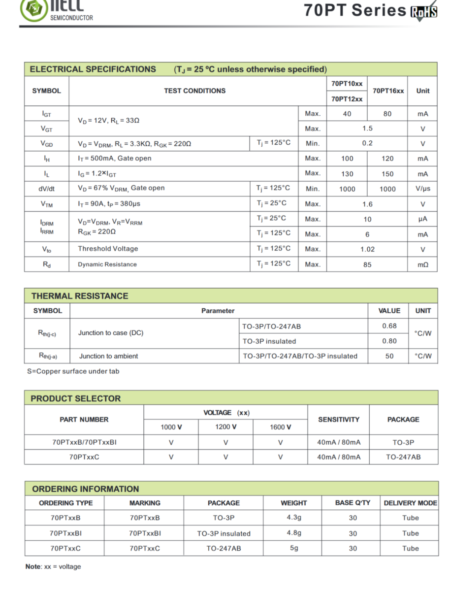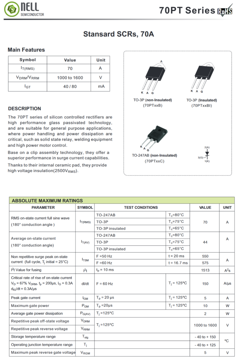 1X 70PT16BI NELLSEMI Standard SCR 70A 1600V Thyristor Insulated TO-3P-3