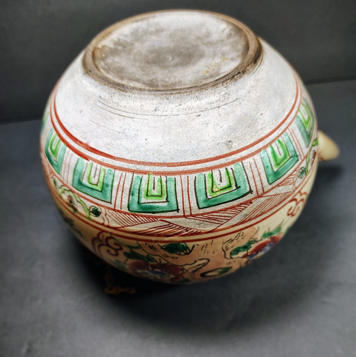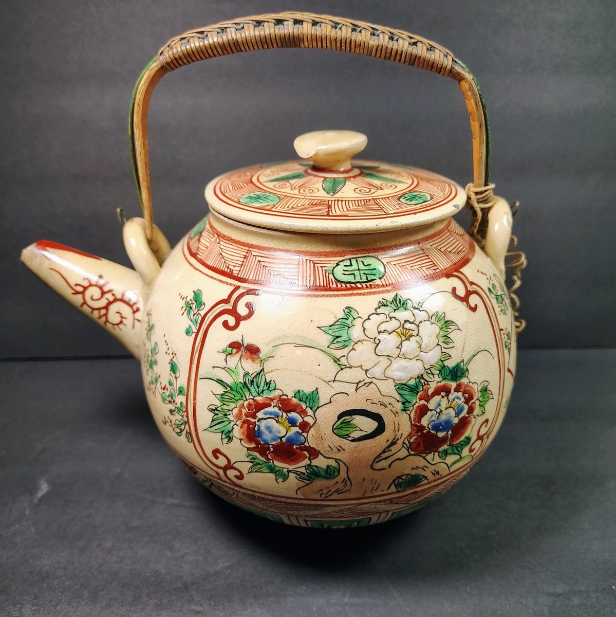 Antique Japanese earthenware teapot, dating to the late Meiji to early Taish? period, approximately 1890?1920. This era corresponds to a time when Japanese pottery workshops produced finely hand-painted functional wares using long-established forms and techniques.