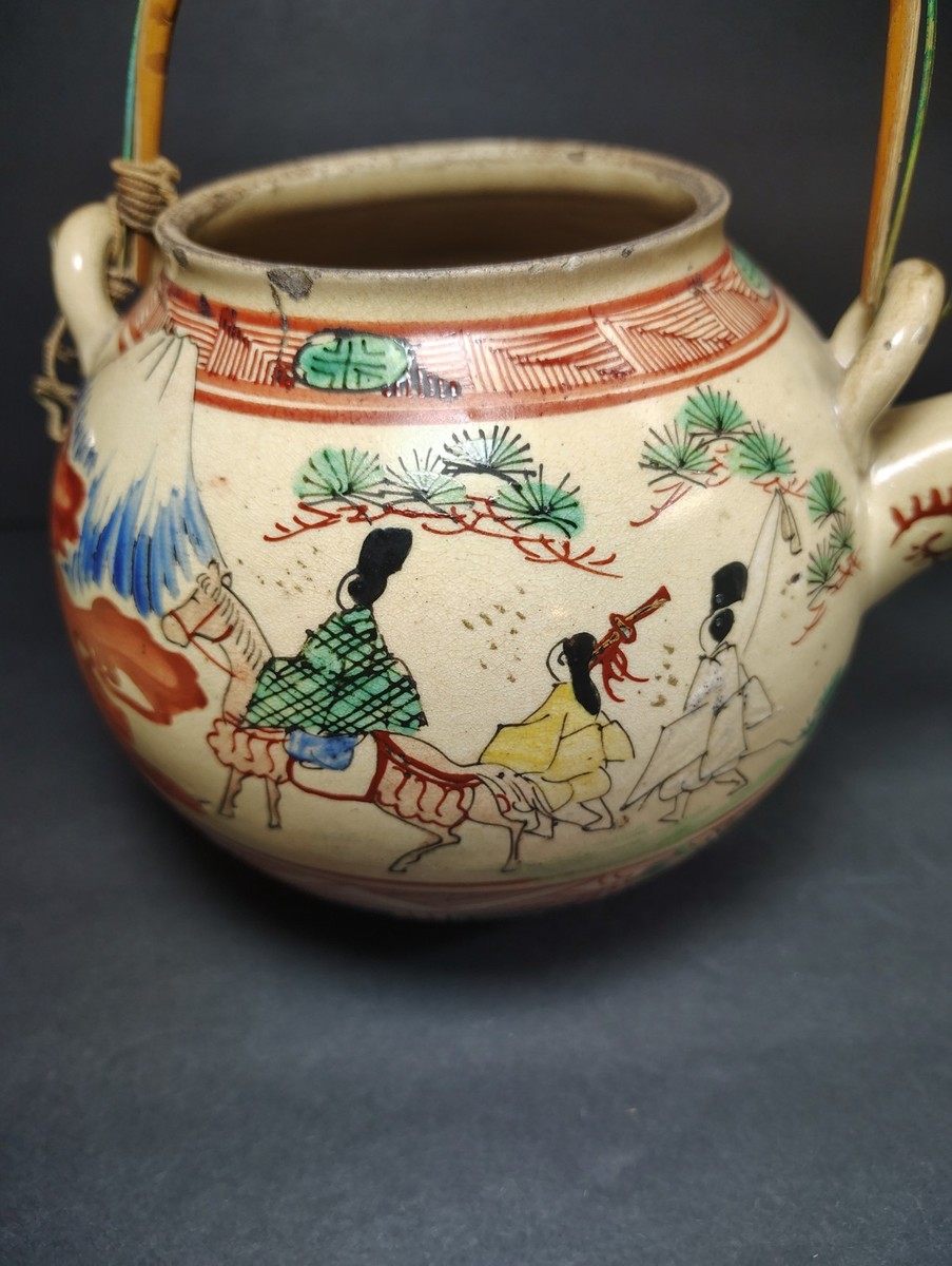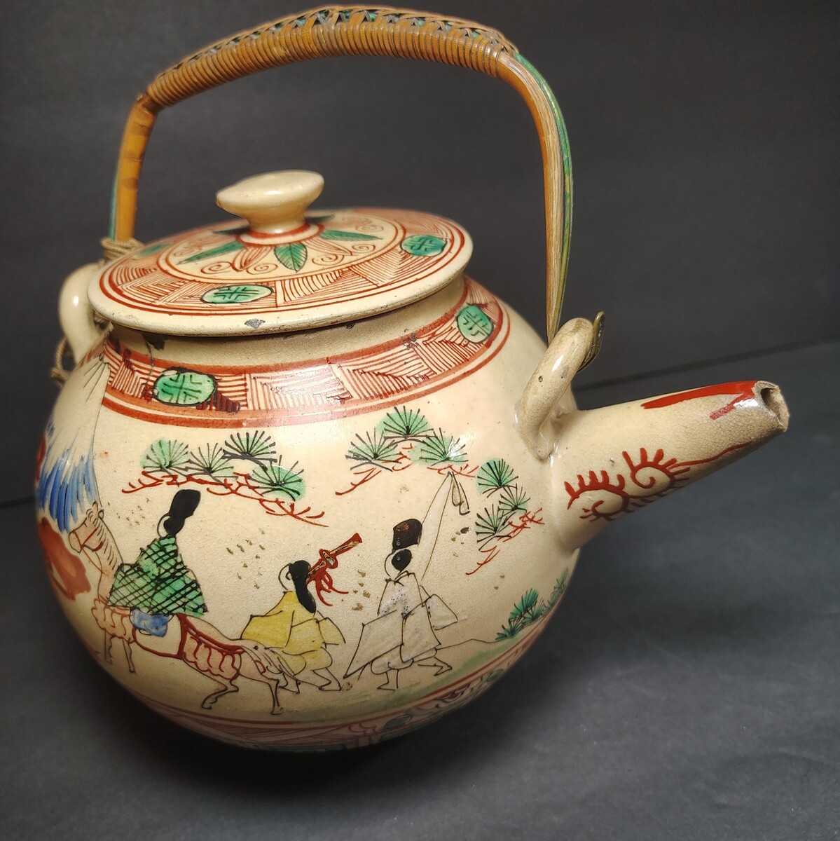 Antique Japanese Meiji Earthenware Teapot Hand Painted Horse Mountain Figural