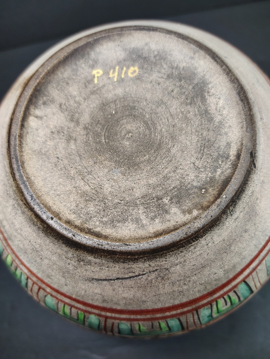 The underside shows a dark linear area near the foot, which is not a crack or later damage. This appears to be a firing or forming characteristic from manufacture, visible beneath the glaze and stable, with no movement or separation. Such kiln-related marks are commonly seen on early earthenware pieces.