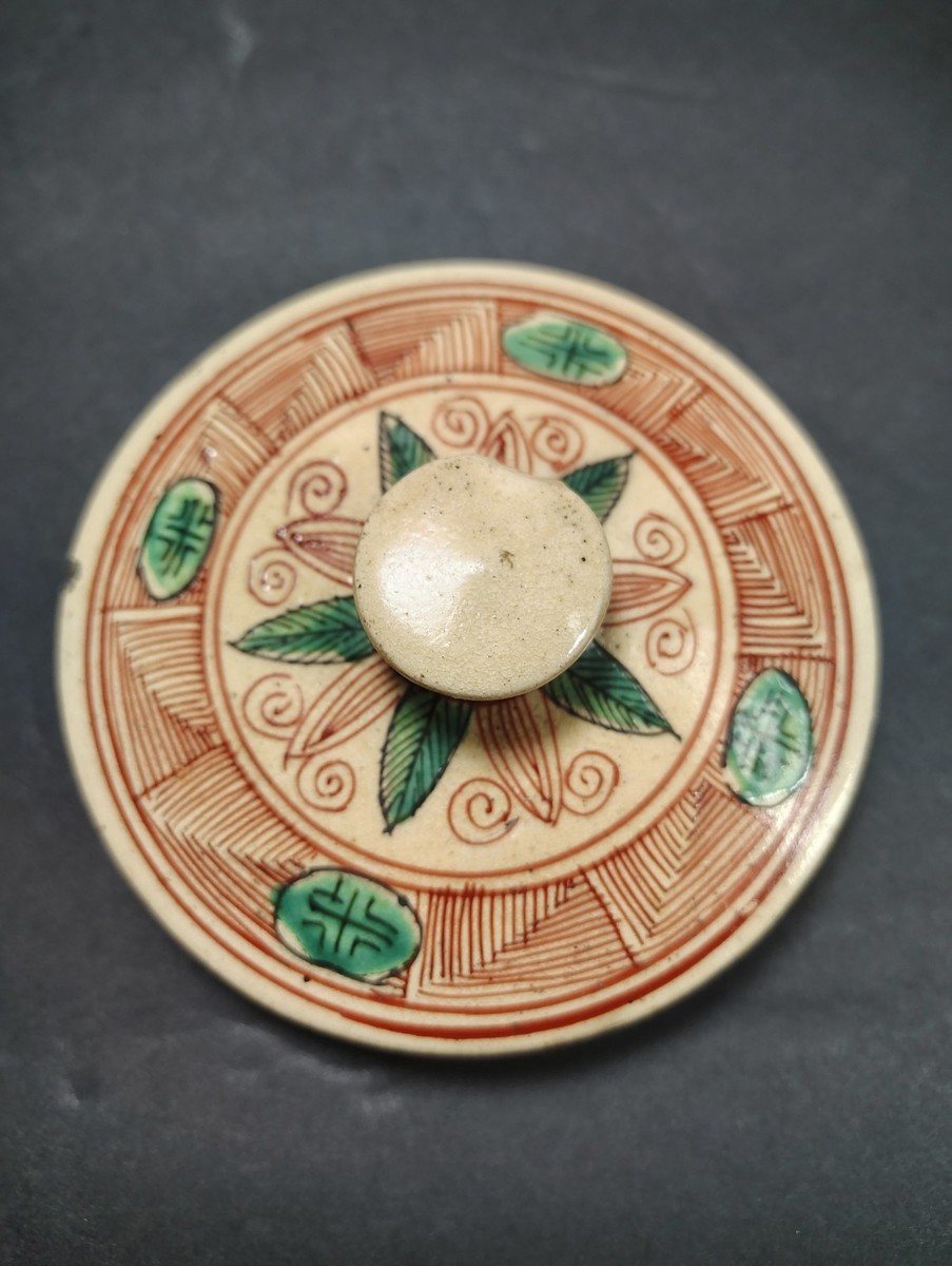 The underside of the lid and base bear matching workshop markings, including an English ?TOP? notation on the lid. These markings are consistent with export-era handling or assembly practices, used to keep fitted components together during firing, glazing, and packing, and are typical of organized pottery workshop production of the time.