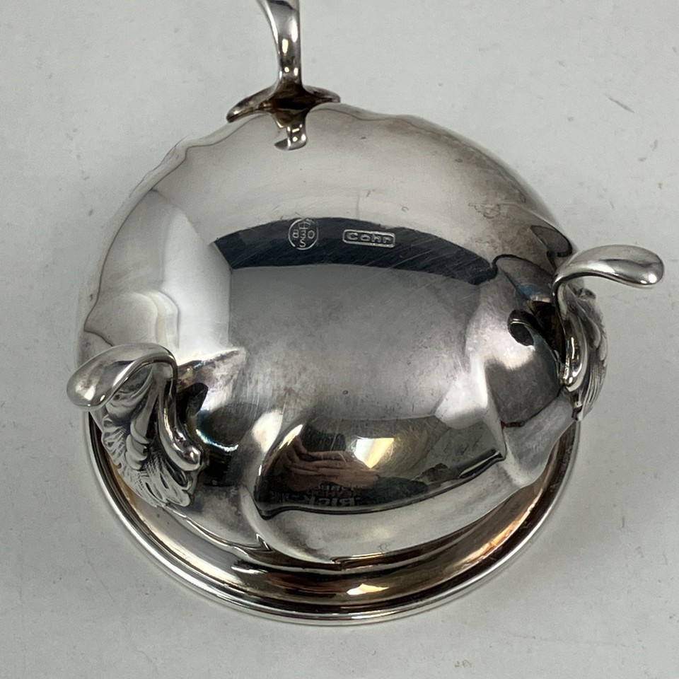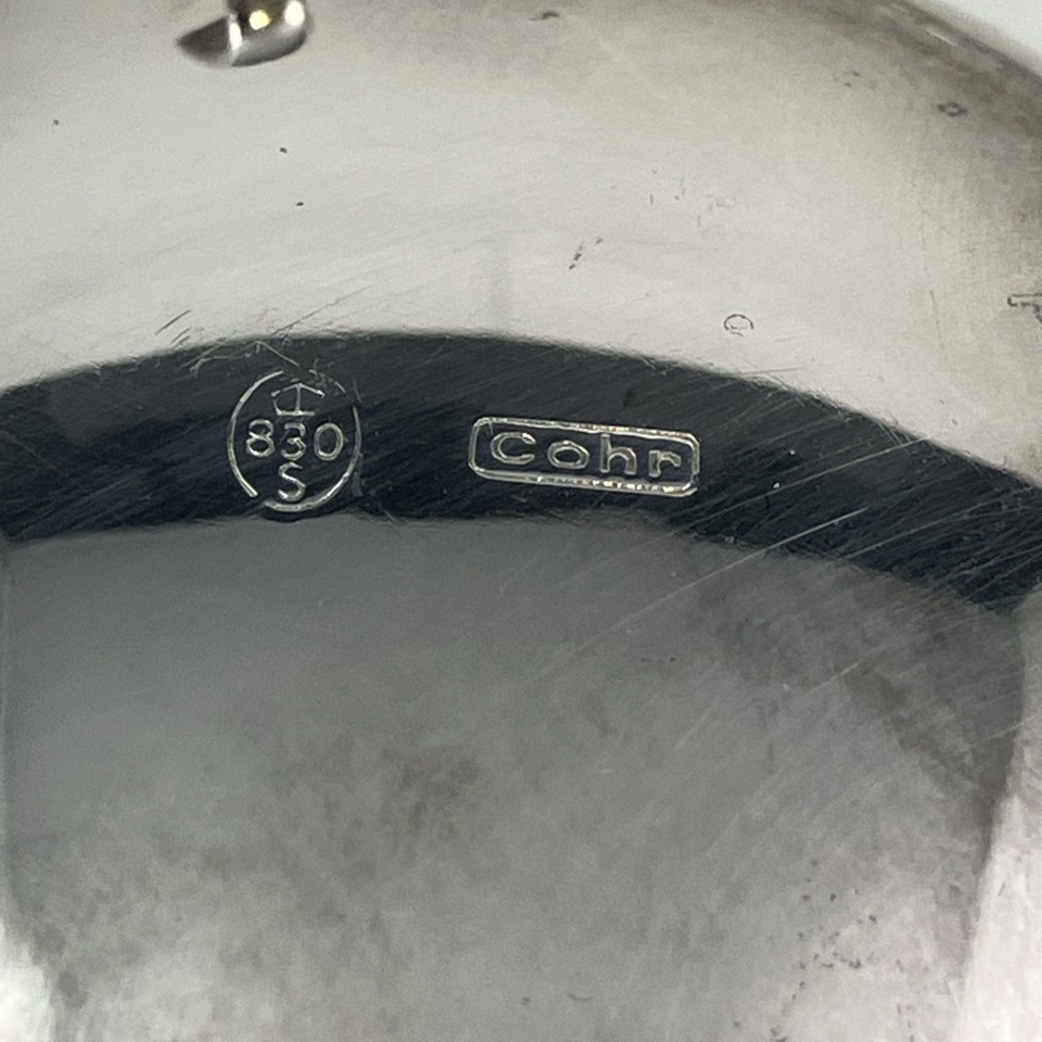 This 830S Silver Carl M Cohr Denmark Salt Cellar with Glass Liner is a rare and stylish piece of silverware originating from Denmark. This footed salt cellar features a sleek Art Deco design typical of Scandinavian craftsmanship from the early 20th century. Made of high-quality silver and accented with a glass liner, this piece not only serves its practical purpose but also adds a touch of sophistication to any dining table or collection of antiques.