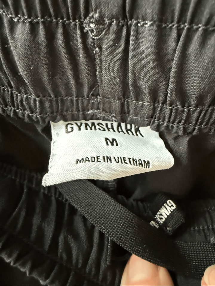 Gymshark men?s 5 inch inseam running shorts in black with elastic and drawstring waist, and hip pockets. Logo at the hem. Unlined. Tag size medium