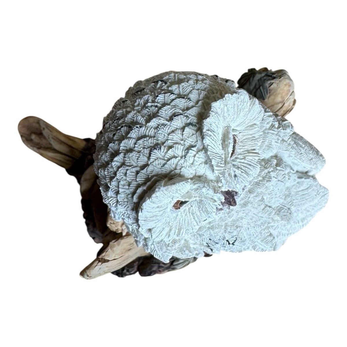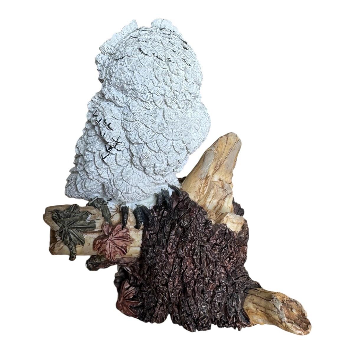 Vintage White Snow Owl Figurine on Broken Forest Log Resin Bird Figurine