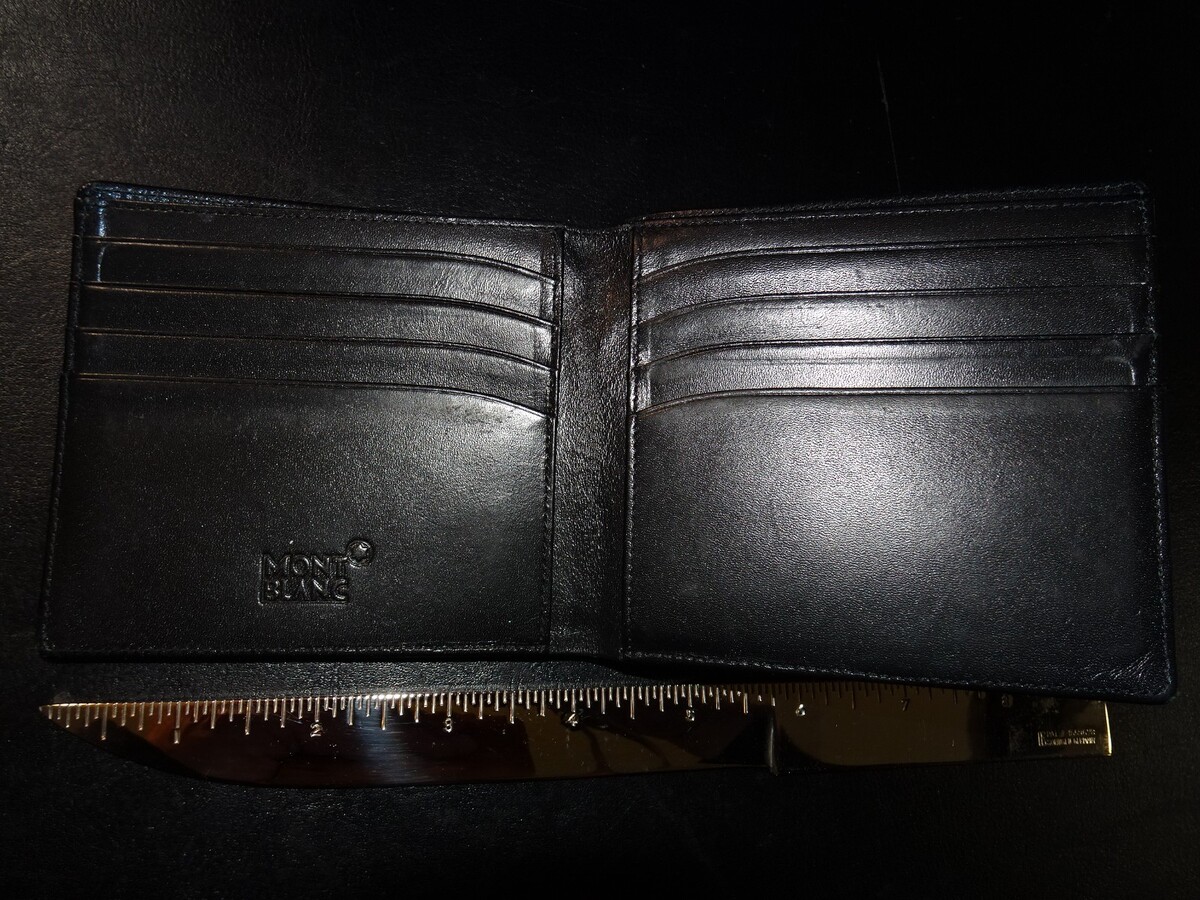 Authentic Montblanc black leather bifold wallet. Made in Italy and crafted from fine smooth calf leather. This wallet features multiple card slots and bill compartments in a classic slim profile.