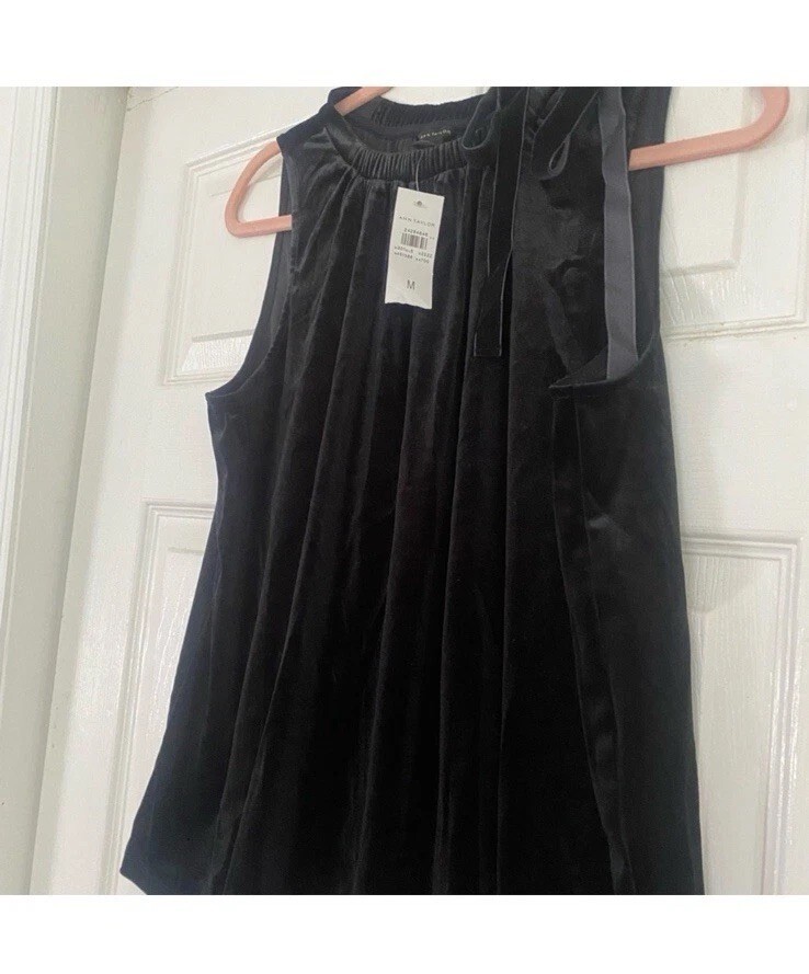 ANN TAYLOR Sleeveless Velvet Blouse Shirt Top Size Med Black with Tie Collar NWT
