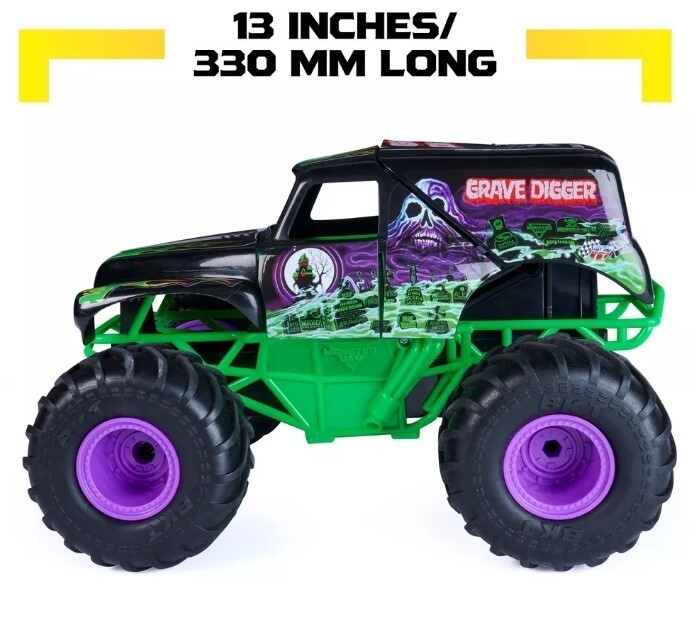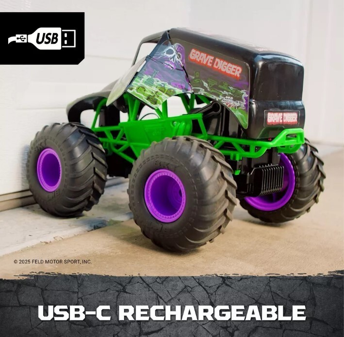 Experience the Monster Jam action in your hands with the Smash Bash Grave Digger RC. This 1:15 scale remote control Monster jam monster truck can take the heat, running into walls and obstacles, indoors and outdoors. With soft rubber tires, authentic graphics and details, pull off epic maneuvers like you are driving the real thing with the full function, easy-to-use remote control, requires 2 AAA batteries (not included). The more you crash, the more smashed your RC becomes to perform stunts and spins. Go from wrecked to repaired with a press of a button from repeatable play. With 2.4GHz frequency, you can race up to six toy vehicles at once and control the Smash Bash Grave Digger remote truck from up to 200 feet away for up to 20 minutes on a single charge via USB-C. With so many other Monster Jam trucks and remote control cars to collect, add Grave Digger, Megalodon, El Toro Loco and more (each sold separately) to your collection and race them all! Rev up your Monster Jam toys and get ready to experience the dirt-flying, car-crushing action of Monster Jam at home to ignite passion and adventure in any fan! Includes: 1 Smash Bash Grave Digger RC