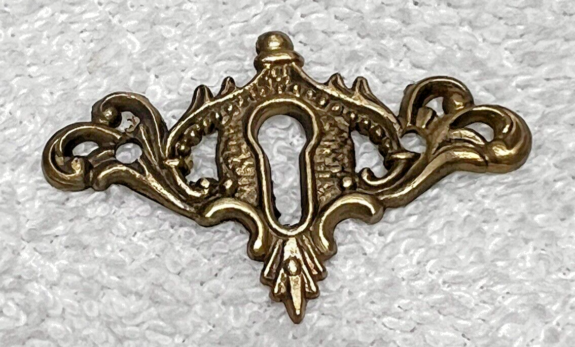 Old Keyhole Scrolls Detail Lock Cover Brass Colored 2 1/8 x 1 3/8 inch Key hole. Some wear. See Photos.