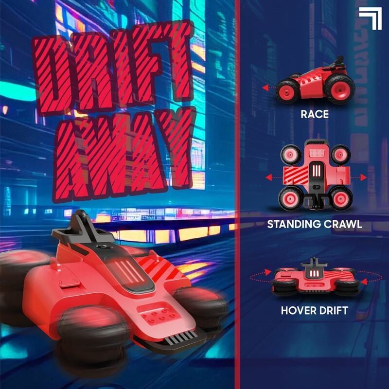 3 unique RC driving modes for versatile play. Wheels rotate 90-degrees to perform maneuvers impossible for other RC cars. Standing crawl and hover drift modes allow for creative tricks and stunts. 2.4 GHz remote control for smooth and responsive driving. Built-in LED lights for enhanced playtime day or night. Contemporary design Model: 1017628