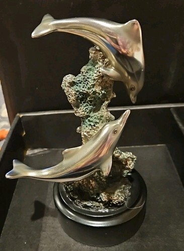 ? This Swimming Dolphins figurine is made of the highest quality resin, undergoing the process of silver electroplating giving it a uniform shine on the inside as well as the surface of the figurine. This process makes the figurine resemble the look of actual bronze but with much lesser weight. To add sculptural aesthetics and display worthiness, we add accent black plastic base to the sculpture.