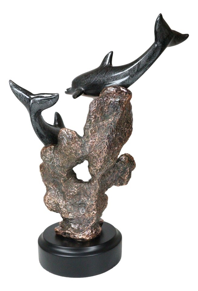 ? Hear the call of the ocean with this breathtaking sculpture featuring 2 bottlenose dolphins swimming around the deep ocean's beautiful coral reef. Our impressive, 360-degree, bronze electroplated resin figurine is expertly finished with a hand-applied, classic sepia bronze and black patina and polish to bring out the amazing detail.