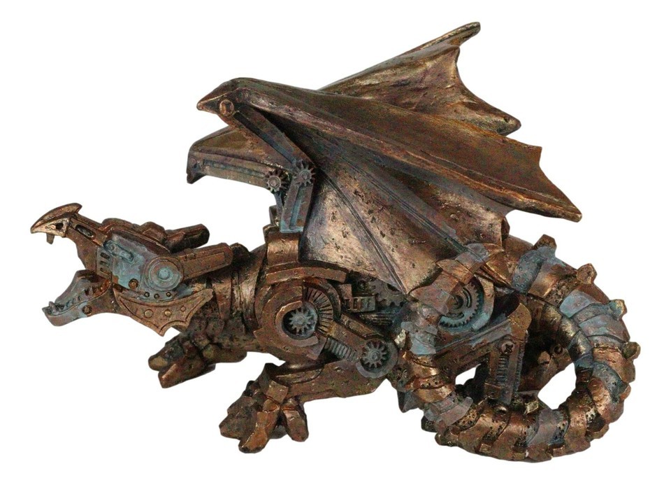 ? Dragons are powerful beasts, and this steampunk style mechanical dragon is nothing less than impressive! This faux geared dragon boasts a hand painted metallic copper finish sure to make any dragon enthusiast proud! No scales or muscles are needed when you have the power of a machined dragon at your fingertips.