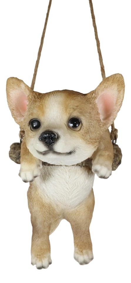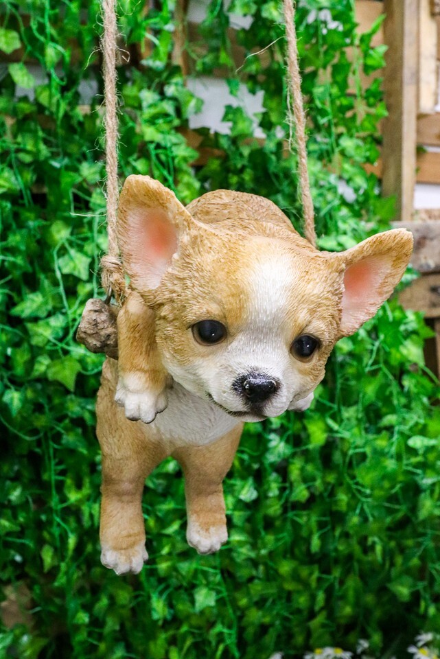 ? Macrame is super hot right now and so we thought it will be delightful to combine the decor with our realistic lifelike animal sculptures! This particular model features a teacup chihuahua puppy playfully hanging on a swing branch. The sculpture comes with jute strings that hang 8 inches above the head of the figurine. It will be an awesome macrame wall or ceiling or branch hanger for your decorative taste!