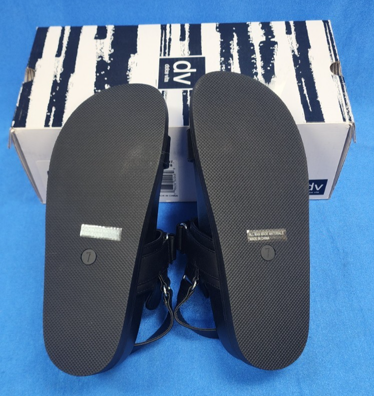 The Dolce Vita Women's Argyle Rargyleo Sandals in size 7M are sleek and stylish black sandals perfect for casual occasions. With a slip-on closure and flat heel, these sandals offer both comfort and convenience. Made with leather and a synthetic insole, they are durable and easy to wear. The strappy open-toe design adds a touch of elegance, while the rubber outsole provides excellent traction. These sandals are a versatile choice for the summer and spring seasons, and are a must-have addition to any woman's shoe collection.