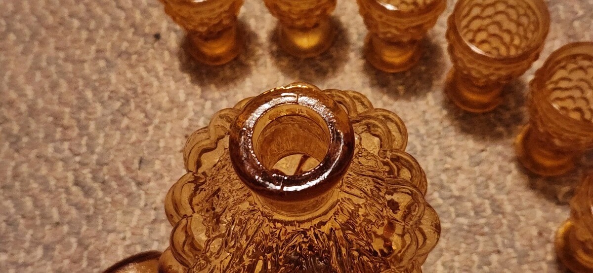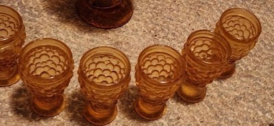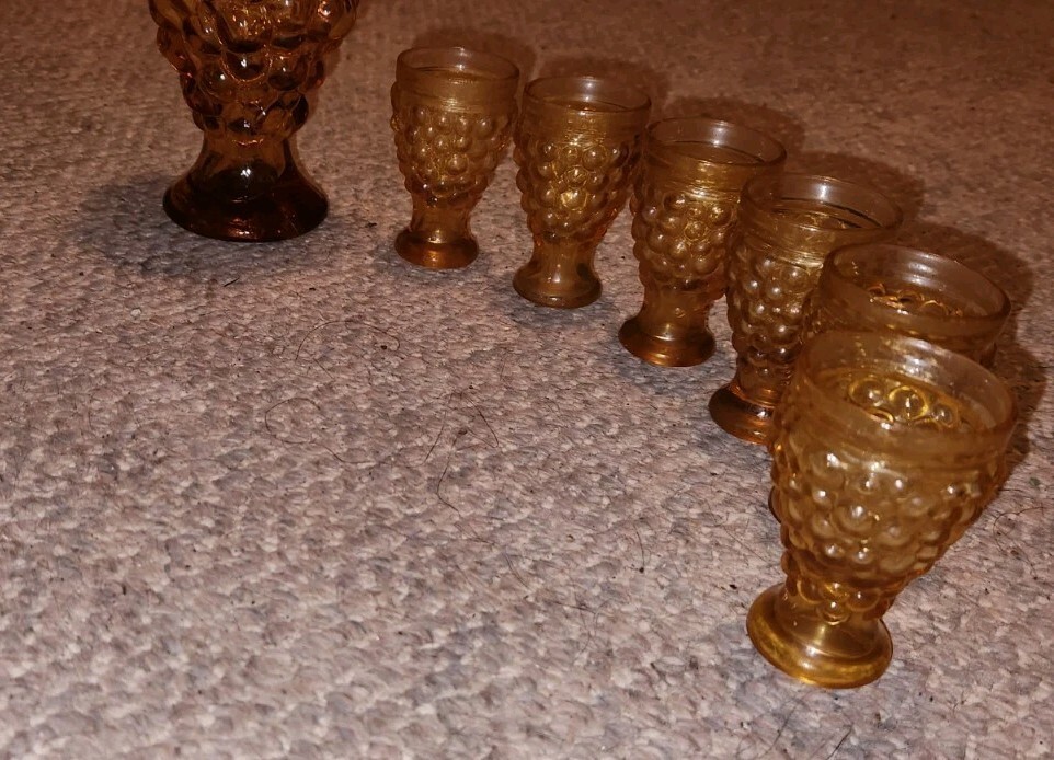 Vintage amber color wine grape cluster decanter. with 6 shot cordial glasses. Measures 11 inches tall. Classic bar piece. Glasses are 3 inches tall. Not chips or cracks noticed.