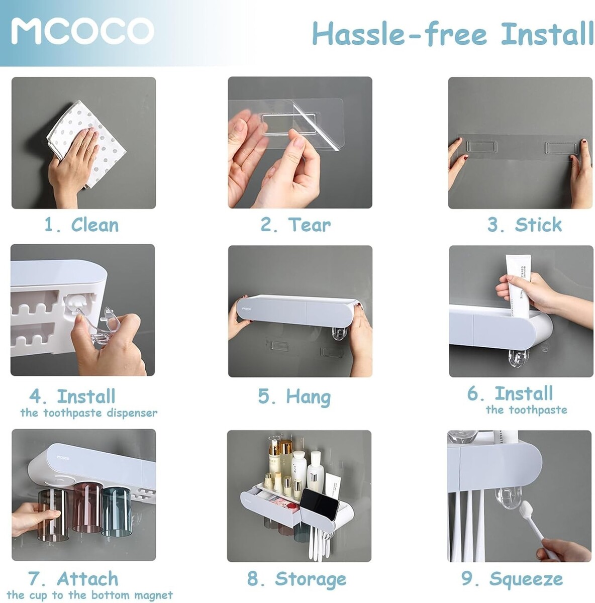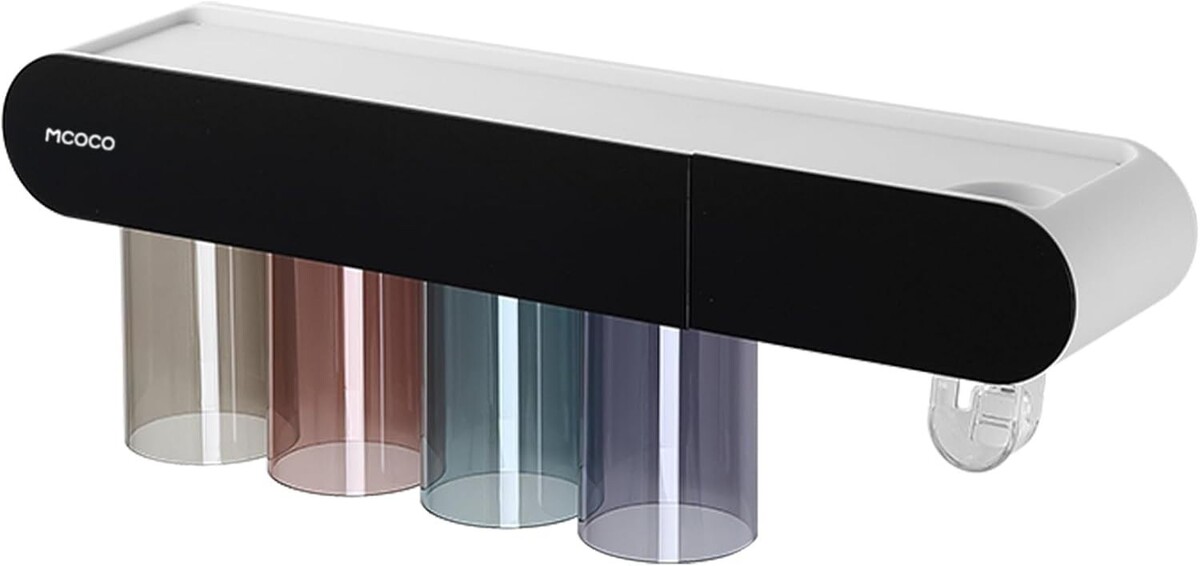 toothbrush holder comes with 4 upside-down cups are dust-proof and waterproof, 1 toothpaste dispenser and 8 toothbrush slots; Features large capacity tray and drawer for organize bathroom accessories such as electric toothbrush, toothpaste, razors, dental floss, and cosmetics; It is also equipped with a mobile phone holder for your convenience