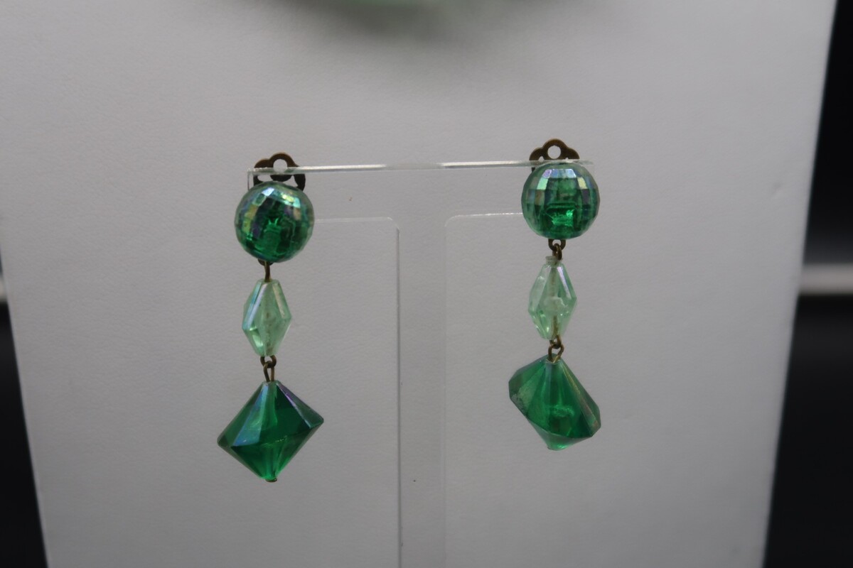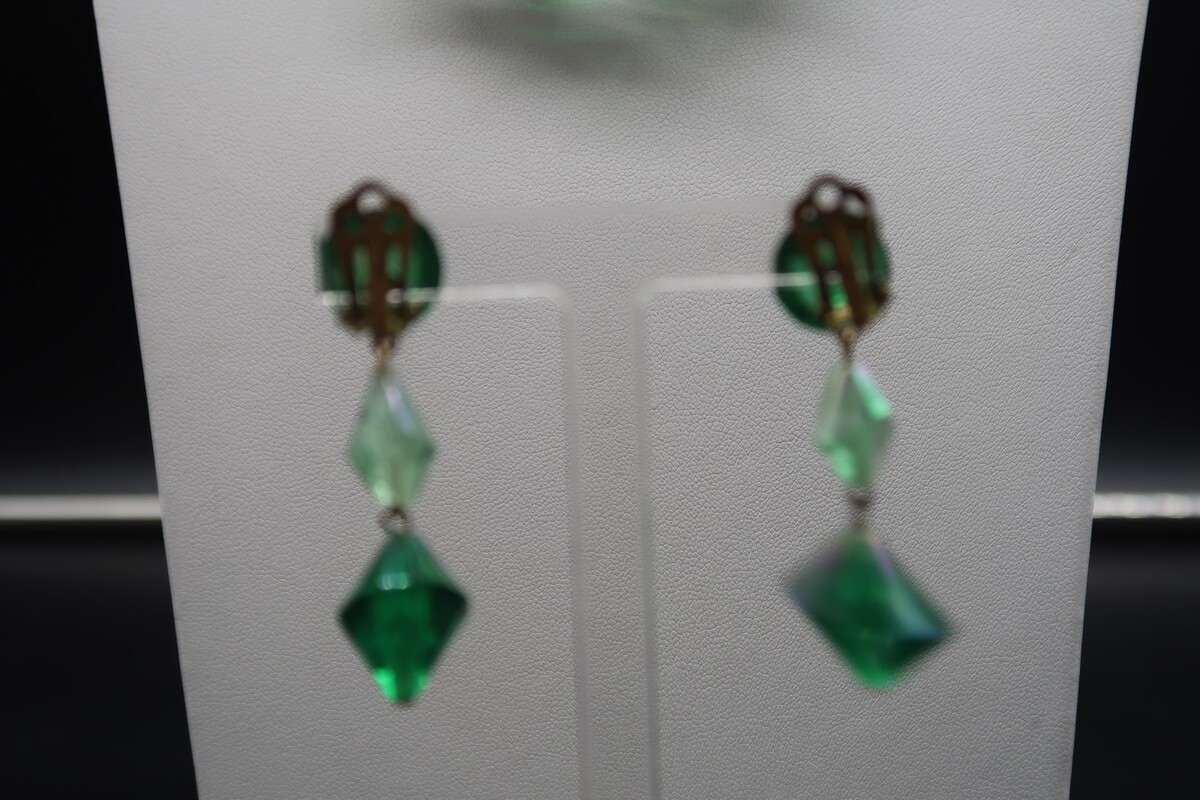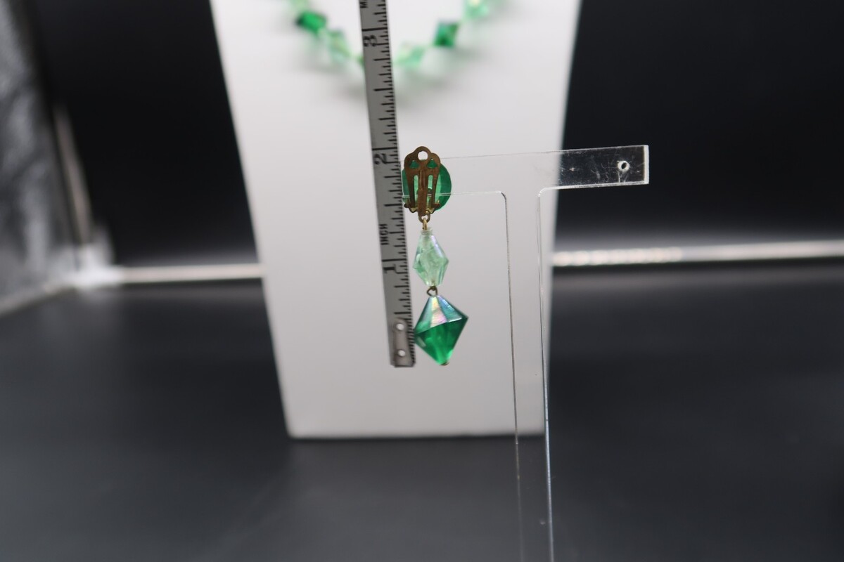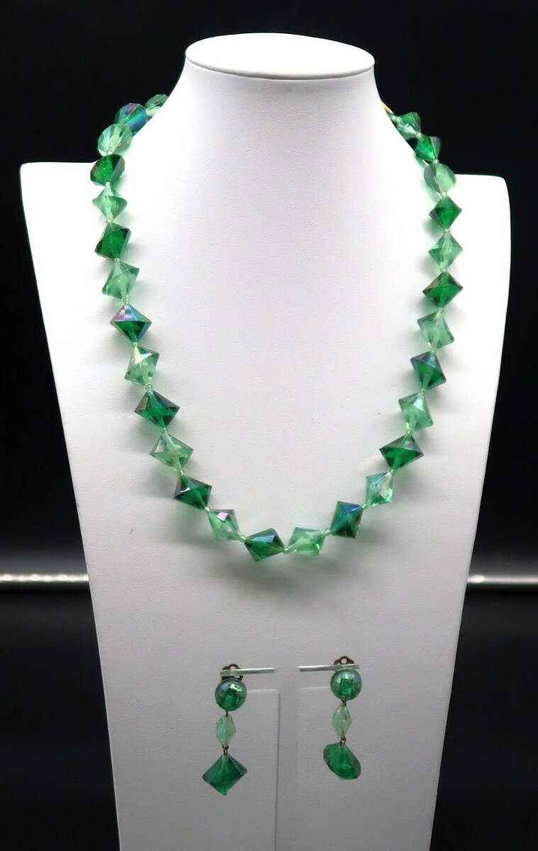 Vtg Green Optical Prism Beaded Necklace & Clip-on Earrings Signed Austria